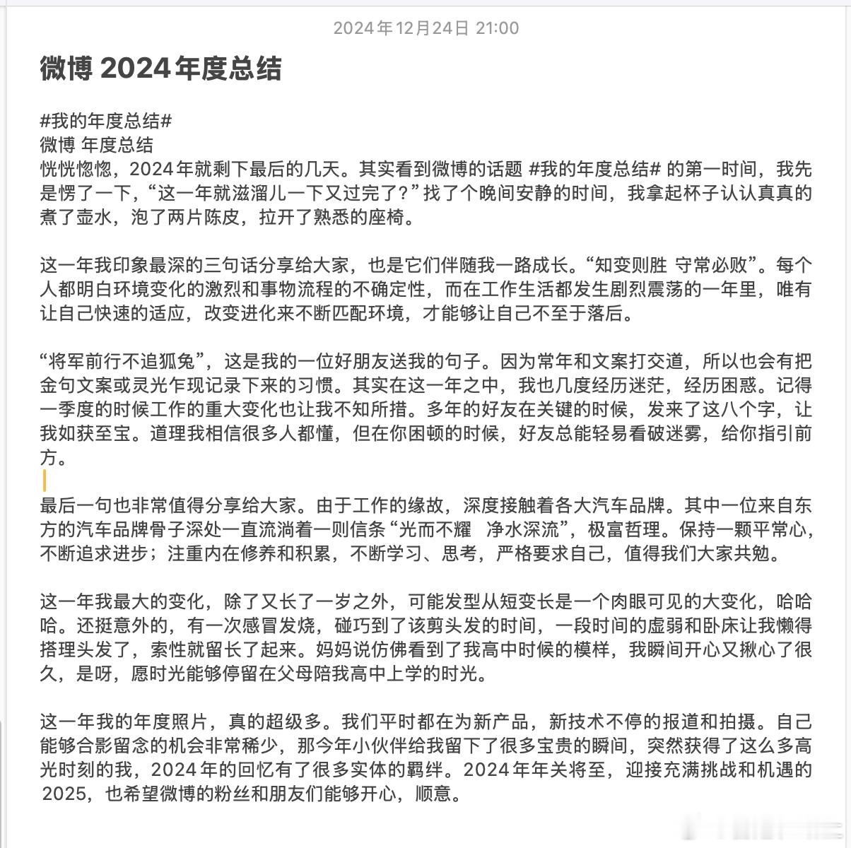 我的年度总结 还是自己的工作流能够提醒自己,时间很清晰:去年的年度总结,写于2024年12月24日21:00 。今年就不沏陈皮茶了,夜半继续坐在那把座椅上,开始新一年的年度总结。2025年可不是滋溜儿一下过去的,时间很饱满,体验很充实,工作很密集,运动有坚持,喜欢的事情多多做,膈应的东西尽远离,2025年奋斗着奋斗着就这样要过去了。飞行的时候我总喜欢翻翻相册,看看之前的日历日程,往前看一看不光是念旧,更多的是复盘,我自己认为这是一个好习惯。受益2024年的总结,这一年里面我开始尽可能给自己留更多的影像,他们像是给每一段回忆装上了一扇任意门,连工作笔记都会因为这些jpg变得更为清晰。先聊聊工作,「聚焦」是贯穿2025的关键词,时间是公平的,我们不可能照顾好那么广泛的方方面面,与其模模糊糊半瓶咣当,不如全身心的投入精耕细作,对锄头,对麦田,对深秋,对自己都是更加合理的交代。 Ai今年更多的进入工作流,原本是尝试体验,今年更多的渗透成伙伴和员工角色,合理的应用让效能大幅提升,推荐给大家,并且让工作互联网+早已是大势所趋,如果不能上+,就好好从头检查自己。未来,趁着双旦给自己按个暂停键,很多事情需要归档,逻辑要更加收敛,形成合力,让工作目标更加清晰明确。对了,去年春节前的那个彻夜沟通会,效果非常不错~ 今年继续执行谈谈生活,「节拍」的作用在脑子里很明确,不知道因为年纪的原因还是处理过速,突然在脑袋上会偶发一根白发,自己终于也有了“为家过度操劳”的铁证哈哈。这一年运动,饮食,生活的规律逐渐成型,会因为自己的拖延或者工作的干扰引发节拍紊乱而变得自责。有几个小事情坚持的不错,表扬一下自己:午休睡眠15分钟就起,每天坚持多重维生素摄入,每周两次对抗运动,当有生活矛盾发生时告诉自己,笑一笑就会没关系~新的收获,从跟朋友深度沟通,进化成了给专业的人群讲课;从关注兴趣,升级为泛兴趣领域都做尝试,勇敢认识新的自己,跳出熟悉的工作流;从工作,升纬管理人或投资人的眼光去审视问题,审视发展;学会跳出自己一定距离回看自己。最后,我变成了更真实的我,这一年,我会因为很多炙热的文字而眼眶酸痛,会因为很多很多真情的视频安静的躲到角落热泪滚烫,他们之中很多改变了我的预定轨迹,新的一年我定了几个小目标,要一一去努力尝试。最后,2025行将交替,道一声辛苦啦,2026,同样希望我的朋友们能够开心,多多交流,从虚拟世界走进真实生活,真的开心,真的顺利。 北京