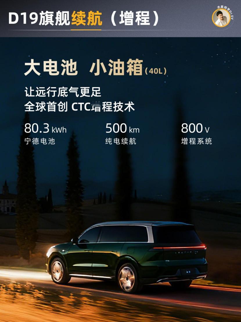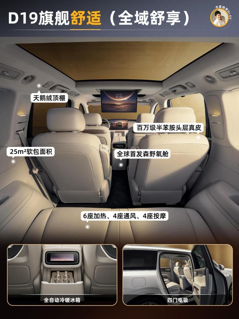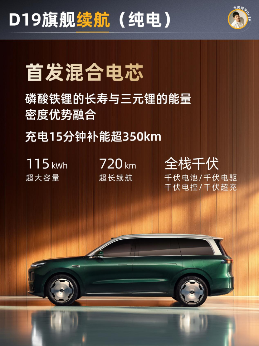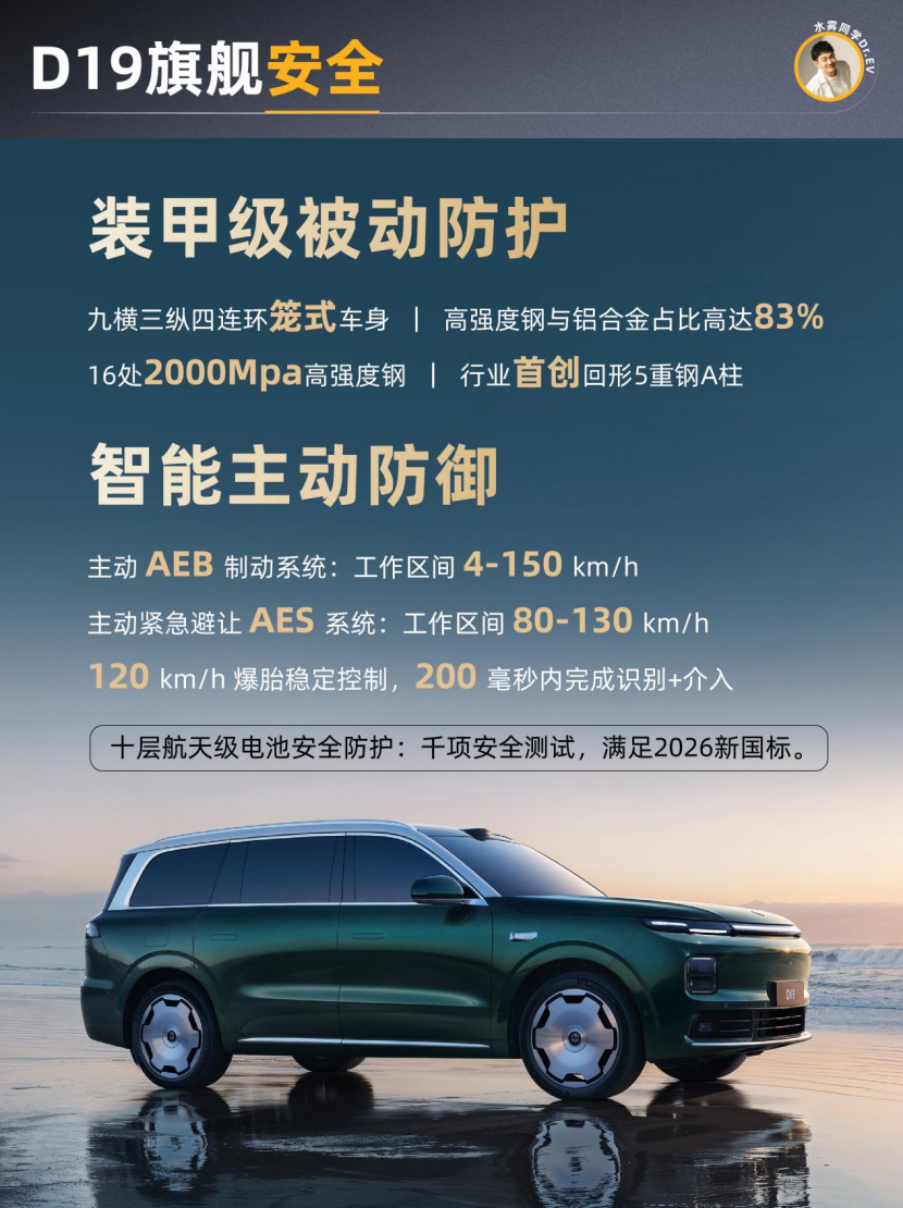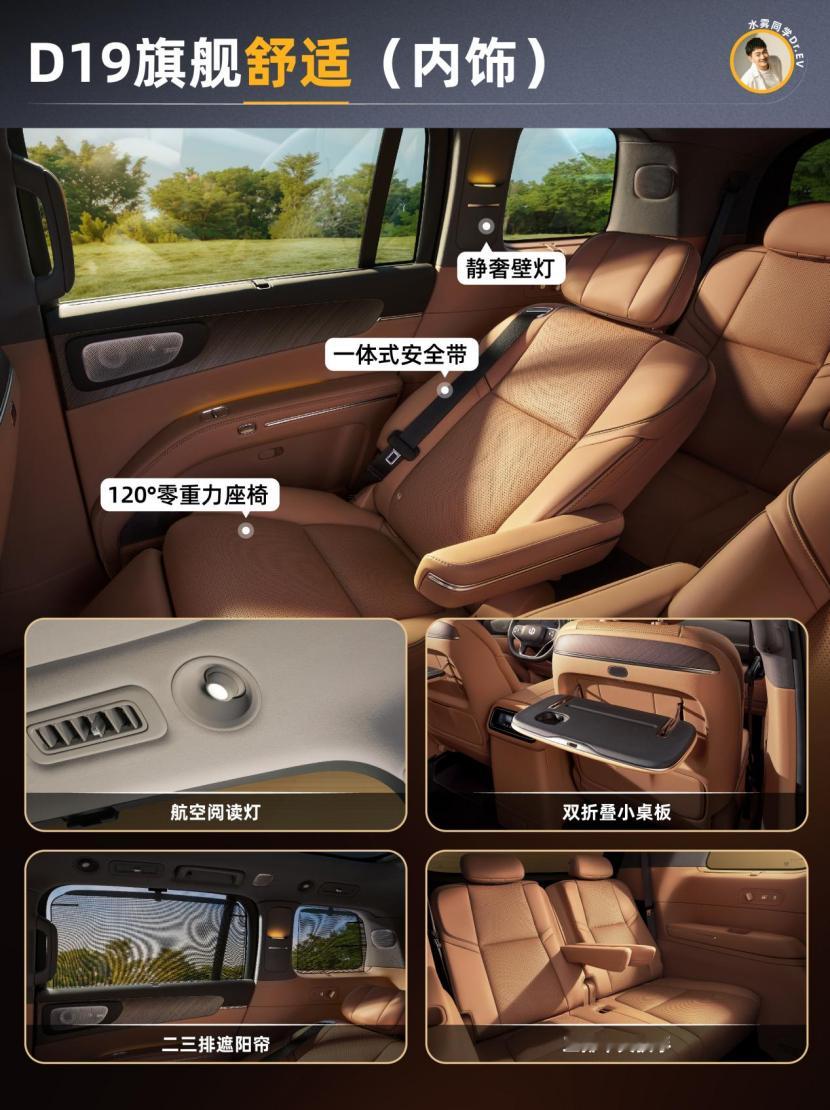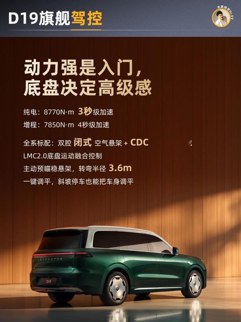 零跑9系豪华双旗舰同台首秀就在今天零跑迎来了它的十周年发布会,不仅如此,这场发布会还重磅推出了零跑的两台D系列车型:零跑D19和零跑D99,真的是信息量颇大!不过,我已经把重点整理好了,建议收藏在观看。续航:增程版电池做到 80.3kWh,纯电能跑 500km,大电池小油箱,有急事就加油,平时就用电,照顾到家里每个人买车的痛点。纯电版,115kWh 电池包,720km 续航。高速能跨2个省,不用提前规划充电点,而且有1000V的高压平台,充电15分钟,补能超350km。不仅充的快,开起来能耗也低。2️⃣ 舒适配置:座舱采用半苯胺头层真皮,与百万级尊界S800同款同供应商,顶棚天鹅绒材质,搭配大师级工艺,双旗舰品质更显尊贵。二排头等舱:全车座椅支持电动调节,覆盖6座加热、4座通风按摩、4门电吸。二排带有120° 真零重力座椅,长短途都很轻松~三排同权:像座椅加热、遮阳帘、靠背调节、双扶手都给到。还有全球首发森野氧舱,车规级制氧我一开始觉得挺玄,但想想长途、夜里开车、甚至高原,确实比单纯开窗靠谱。3️⃣ 驾控:我一直觉得,大车最怕两件事:开着累、转弯难。不过D19全息标配双腔空悬 + CDC,还有主动预瞄镜稳悬架,摄像头雷达实时扫描前方30米路面,可实现“过坑不入坑”的凌波微步效果。圆规/坦克掉头,转弯半径小至3.6米,遇到窄路、地库,真的太好用了。4️⃣ 智能:双8797 芯片、算力满足未来5年升级冗余。可实现车位到车位的全场景通行。辅助泊车支持0-360°任意夹角的车位识别和泊入。VLA辅助驾驶大模型赋予车辆“思考力”,辅助驾驶越用越聪明。6️⃣ 安全:车身采用九横三纵四连环笼式结构,高强度钢与铝合金占比达到 83%,A柱采用行业首创回形五重钢结构,在正面、偏置及翻滚等多种极端工况下,增强乘员舱的安全性,细节好评。短路后的电池包72小时内不起火、不爆炸,完全满足 2026 年新国标要求,看不见的地方,做到更高标准。✨总结D19这台车给我的感觉是:是把30万级用户真正会用到的东西,一次性给齐。空间够用、续航不焦虑、开着不累、坐着舒服,这是很多家庭换大车最真实的需求。发布会上顺带亮相的 D99,同属D系列,很多核心技术都会和 D19 共用,只是把空间形态和使用场景,转向多人出行和接待。大v聊车