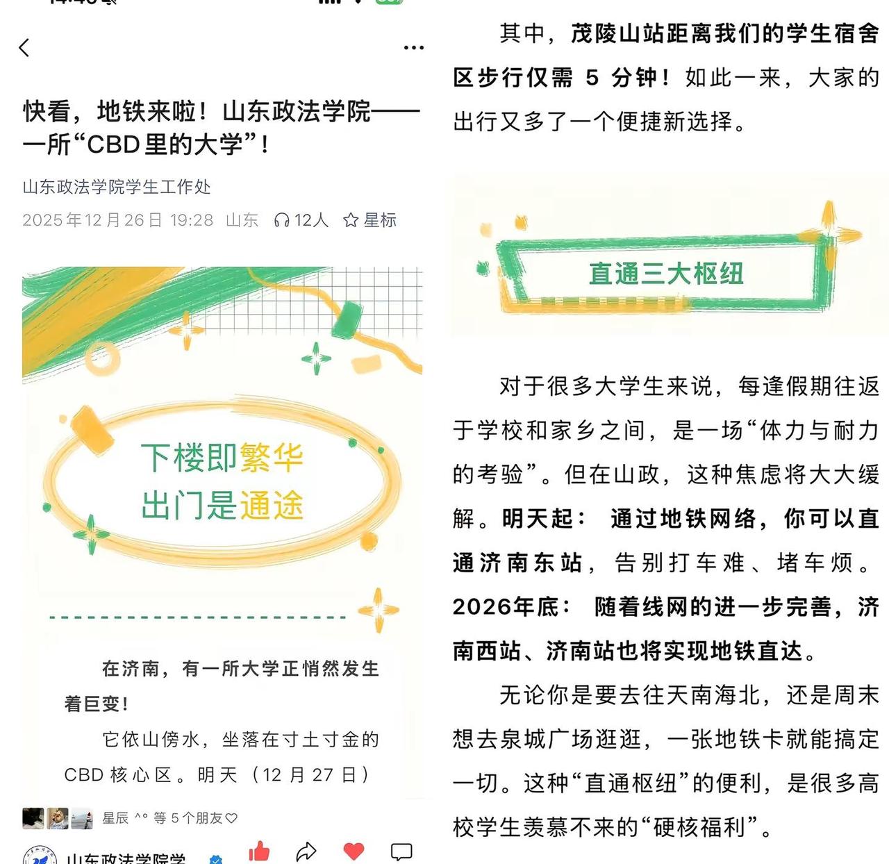 济南地铁三线齐发,山政从此进入地铁时代 今天上午,4号线 济南地铁6号线 济南地铁8号线 三线齐发,也是第一时间前往探访,山东政法学院 东门紧邻6号线茂陵山站入口,直通济南东 机场南 济南西站三大枢纽,出行更加便捷。同时,四号线的开通意义更为重大,经十路高峰时期的拥堵情况将得到有效改善💪济南地铁