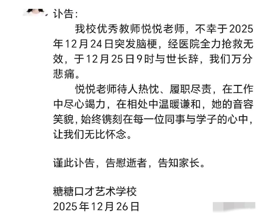 山西运城美女老师因脑梗去世,年仅32岁,长的很漂亮,一点也不胖,真的是太可惜了。 杨悦是运城一名口才老师,在当地很有名气,经常带着学生到各地比赛,突然大面积脑梗去世,让家人和学生都很伤心。 她的经历堪称奋斗史,原本从一个普通单位上班的小姑娘,到深耕7年口才教育的老师,能够拿到年薪十几万,真的很不容易。 有人可能会说年薪十几万不是很正常吗,在工厂上班的蓝领也能拿到这些工资。如果是在北上广深这样一线城市拿到月薪过万的工资可能不算什么,可这是在一座五线的小城市,能拿到月薪一万多的,可谓是凤毛麟角。 32岁的她看着也不胖,为什么会得脑梗呢?可能这里有一个误区,认为肥胖的人有三高症才会得,其实不然。 很多人经常在高压状态下,或者休息不好,就会是身体出现异常呢,尤其那些经常喊累的人,很有可能身体在告诉他让他停下好好休息,脑梗跟胖瘦有关联,但非绝对。 这真的是太可惜了,她还是两个孩子的妈妈,孩子都还小就失去了妈妈,无比心痛。 身体是革命的本钱,事业虽好,但是不能用牺牲身体健康的方式去拼。累了就歇歇放松放松,不要只顾着忙赚钱,忙事业,忙家庭,也要对的起自己的身体。