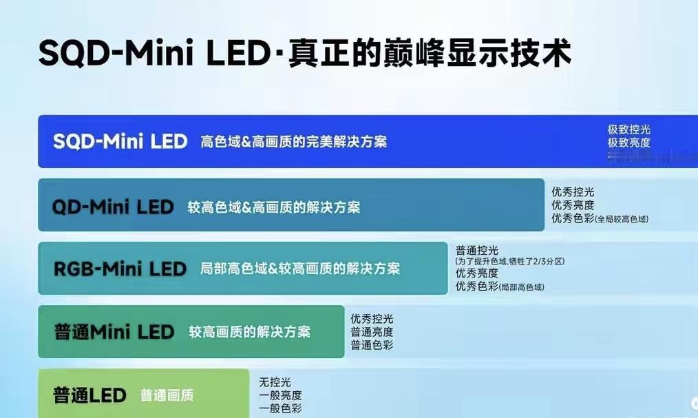 Mini LED技术谁更强?你不会还只看色域选吧! 选电视总是会让我们陷入到很多参数中去,没有办法区分什么才是关键参数,当我们问客服,基本上都是挑好听的来说,也没法分辨清楚什么是关键。 但话说回来,一台电视的好坏,确实和这些参数密切相关。尤其是最近很火的Mini LED电视,很多人只盯着“高色域”一个指标,其实这可远远不够! 高色域≠高画质,这些细节你得懂 很多人以为色域越高,画面就越好。但真相是,色域只是画质的一部分,还得看对比度、亮度、控光能力这些因素。这些参数中,要非得说哪个更重要,那肯定是对比度,而不是色域,只有色域,而控光不好,对比度不高,那画面也会失真的。 所以,还得看它怎么实现这些参数之间的平衡。 Mini LED的技术之争里,SQD vs RGB属于两大热门,到底谁更靠谱? 说到Mini LED,就得聊一下它的两种技术路线:SQD-Mini LED和RGB-Mini LED。 总结来说,RGB-Mini LED:色域高,但有短板 RGB-Mini LED用的是红、绿、蓝三原色LED灯珠,理论上可以实现很高的色域覆盖率,但问题是,这种技术需要三颗灯珠组成一个背光分区,分区数量会大打折扣。比如标称1000个分区,实际可能只有300个左右的实际分区。 分区少就意味着控光精度低,对比度也会受影响。更致命的是,RGB三色灯珠容易出现串”问题,比如红色会跑到到绿色区域,画面细节就会模糊。而且因为需要较长的混光距离,机身也很难做薄。 SQD-Mini LED,综合表现更均衡,是当前综合画质最优的技术 SQD-Mini LED是TCL最新推出的技术,它用单颗蓝色LED芯片发出高纯度白光,再通过超级量子点技术发出纯净的三色光。这种设计有几个好处: 1. 分区更多,对比度高:同样成本下,SQD-Mini LED的分区数量可以达到RGB-Mini LED的3倍,控光更精准,而且搭配了原生对比度高的蝶翼华曜屏幕,可以实现更高的对比度,画面更立体,更清晰,细节也展现的更多。 2. 色彩更纯净:单芯片设计避免了RGB三色光的相互干扰,画面不会出现串色、偏色问题,能够稳定输出全局高色域,多画面下色彩也能丰富,不会时好时坏。 3. 机身更薄:不需要额外的混光距离,机身厚度可以做到最薄约2厘米。 总的来说,选Mini LED电视,别只盯着高色域一个指标。真正的好画质,是色域、对比度、亮度、控光能力等多因素的综合体现。SQD-Mini LED在综合画质表现上更胜一筹,尤其适合追求高质量观影体验的用户。为什么现在的电视越来越没意思 大屏巨幕电视应该如何选择? 有什么超薄电视的避坑经验? 适合追剧的大屏电视如何选择? 怎么选电视不踩雷 装修 你家电视每天都开吗?