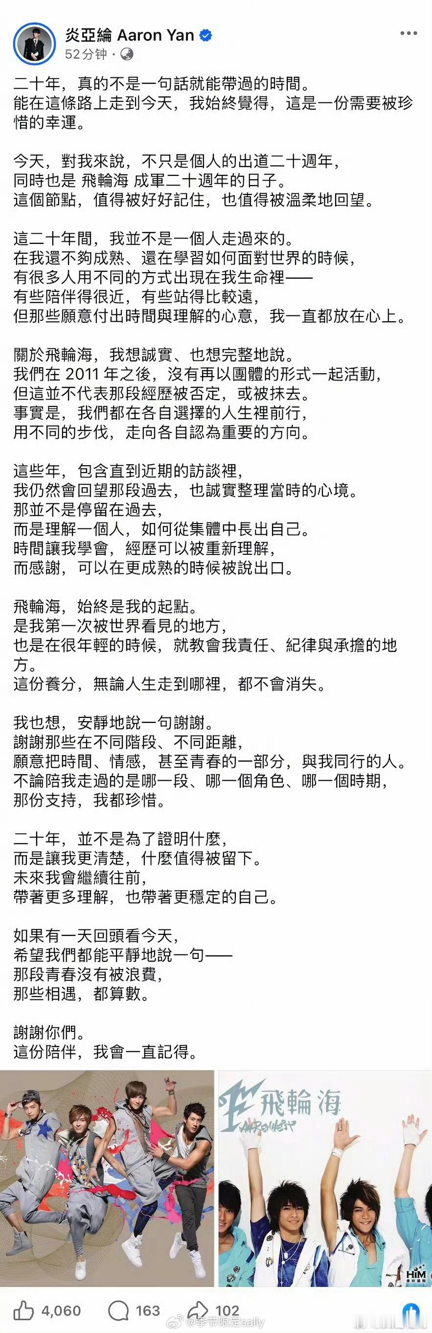 飞轮海出道二十周年,炎亚纶发文感谢飞轮海。微博也发了