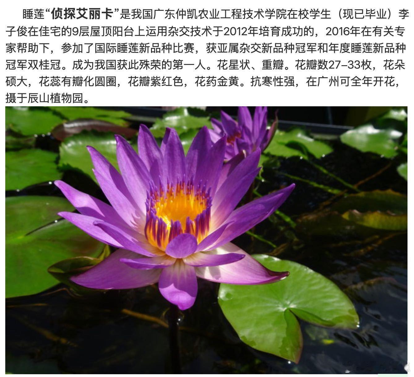 17岁少年在家种出冠军睡莲不怕冷也不怕热的花 给花友们划重点:“侦探艾丽卡”虽然皮实,但养护还是要注意。它非常喜光,底泥最好选肥沃的腐殖土。比起普通睡莲,它不需要特殊温控,南北方的花友都可以放心入手啦!