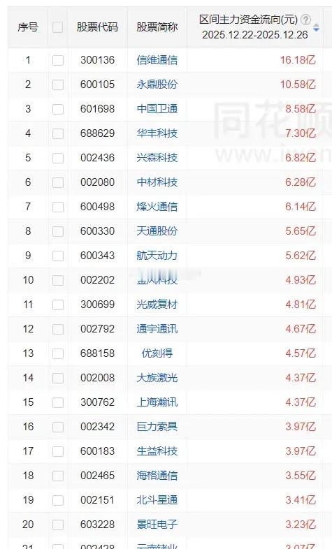 商业航天一周主力资金买入前20股1 信维通信 16.18亿 2 永鼎股份 10.58亿 3 中国卫通 8.58亿 4 华丰科技 7.30亿 5 兴森科技 6.82亿 6 中材科技 6.28亿 7 烽火通信 6.14亿 8 天通股份 5.65亿 9 航天动力 5.62亿 10 金风科技 4.93亿 11 光威复材 4.81亿 12 通宇通讯 4.67亿 13 优刻得 4.57亿 14 大族激光 4.37亿 15 上海瀚讯 4.37亿 16 巨力索具 3.97亿 17 生益科技 3.97亿 18 海格通信 3.55亿 19 北斗星通 3.41亿 20 景旺电子 3.23亿