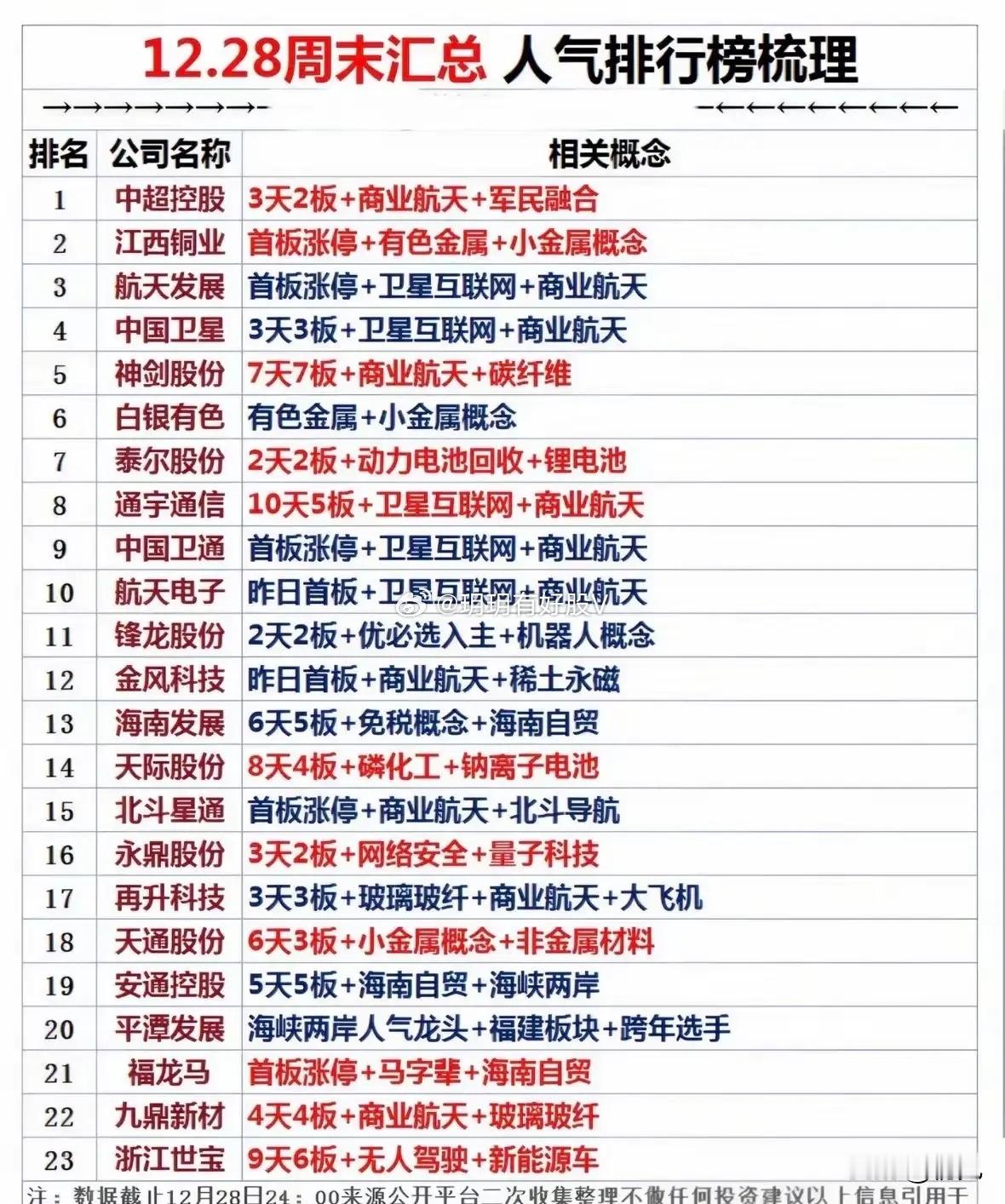 12月28日个股人气排行榜梳理分析!今日人气榜涵盖23只个股,核心题材集中在商业航天(含卫星互联网、北斗导航),其次是有色金属/小金属、海南自贸等;个股以连板股、首板涨停股为主,商业航天题材占比超半数,成为当期市场主线,有色、区域自贸为支线热点。个股梳理分析1. 中超控股:拿下3天2板,主打商业航天与军民融合概念,是航天题材中具备连板表现的代表个股,在当期人气榜单中占据核心位置。2. 江西铜业:为首板涨停股,聚焦有色金属、小金属概念,是有色金属板块里的首板人气标的,受资金短线关注。3. 航天发展:首板涨停,覆盖卫星互联网与商业航天概念,是商业航天题材中的首板核心个股,短线表现活跃。4. 中国卫星:实现3天3板,主打卫星互联网、商业航天,是商业航天板块中连板走势强势的个股,人气认可度高。5. 神剑股份:斩获7天7板,叠加商业航天与碳纤维概念,是商业航天题材里的高度连板股,成为板块情绪标杆。6. 白银有色:主打有色金属、小金属概念,无连板或首板标注,是有色金属板块中具备题材关联的人气标的。7. 泰尔股份:拿下2天2板,聚焦动力电池回收、锂电池概念,是锂电回收领域的连板个股,短线资金参与度较高。8. 通宇通信:实现10天5板,覆盖卫星互联网、商业航天,是商业航天题材中中长线连板的代表,走势具备持续性。9. 中国卫通:首板涨停,主打卫星互联网、商业航天,是商业航天板块的首板人气个股,短线资金追捧明显。10. 航天电子:为昨日首板股,覆盖卫星互联网、商业航天,是商业航天题材的新晋首板个股,属于板块后排补涨标的。11. 锋龙股份:拿下2天2板,叠加优必选入主、机器人概念,是机器人板块的连板标的,独立于主线题材走出短线行情。12. 金风科技:为昨日首板股,覆盖商业航天、稀土永磁,是商业航天与稀土永磁的跨界首板股,题材融合特征明显。13. 海南发展:实现6天5板,主打免税概念、海南自贸,是海南自贸板块的连板强势股,为区域题材的核心标的。14. 天际股份:斩获8天4板,聚焦磷化工、钠离子电池,是新能源化工板块的连板个股,紧扣新能源赛道细分方向。15. 北斗星通:首板涨停,覆盖商业航天、北斗导航,是商业航天与北斗导航结合的首板核心股,题材辨识度较高。16. 永鼎股份:拿下3天2板,主打网络安全、量子科技,是科技安全板块的连板个股,属于科技题材的分支热点。17. 再升科技:实现3天3板,覆盖玻璃玻纤、商业航天、大飞机,是商业航天与大飞机题材的连板股,题材叠加属性突出。18. 天通股份:斩获6天3板,聚焦小金属概念、非金属材料,是小金属板块的连板个股,为有色支线的重要标的。19. 安通控股:拿下5天5板,主打海南自贸、海峡两岸,是海南自贸板块的高度连板股,区域题材的人气标杆之一。20. 平潭发展:为海峡两岸人气龙头,叠加福建板块、跨年选手标签,是区域题材中的人气个股,短线关注度较高。21. 福龙马:首板涨停,覆盖马字辈、海南自贸,是海南自贸板块的首板标的,借题材与市场热点标签获得关注。22. 九鼎新材:实现4天4板,主打商业航天、玻璃玻纤,是商业航天与新材料结合的连板股,题材联动性较强。23. 浙江世宝:斩获9天6板,聚焦无人驾驶、新能源汽车,是汽车赛道的连板强势股,独立走出趋势性连板行情。总结本次人气榜清晰反映出商业航天是当期市场绝对主线,题材内连板股、首板股密集涌现,资金关注度极高;有色金属、海南自贸等支线题材同步活跃,连板股成为人气核心,题材炒作紧扣产业趋势与区域政策方向。本文涉及资讯、数据等内容来自网络公共信息,仅供参考,不构成投资建议!