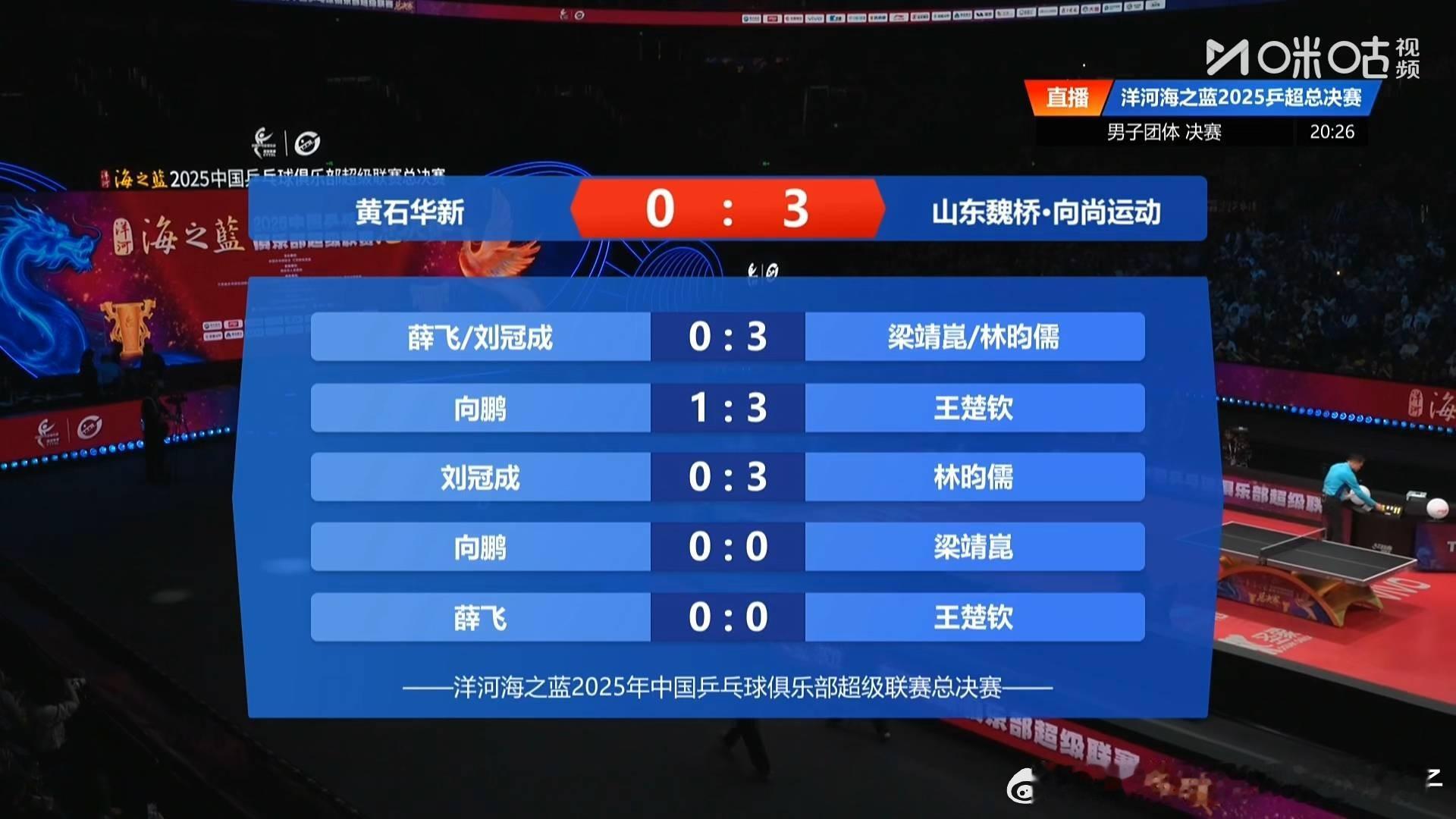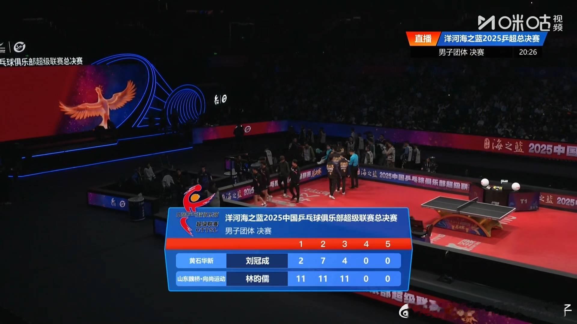 2025年乒超联赛男团决赛:山东魏桥三比零黄石华新 获得冠军🏆 黄石获得亚军🥈梁靖崑林昀儒3比0薛飞刘冠成(1,4,5)王楚钦3比1向鹏(7,-7,7,8)林昀儒3比0刘冠成(2,7,4)