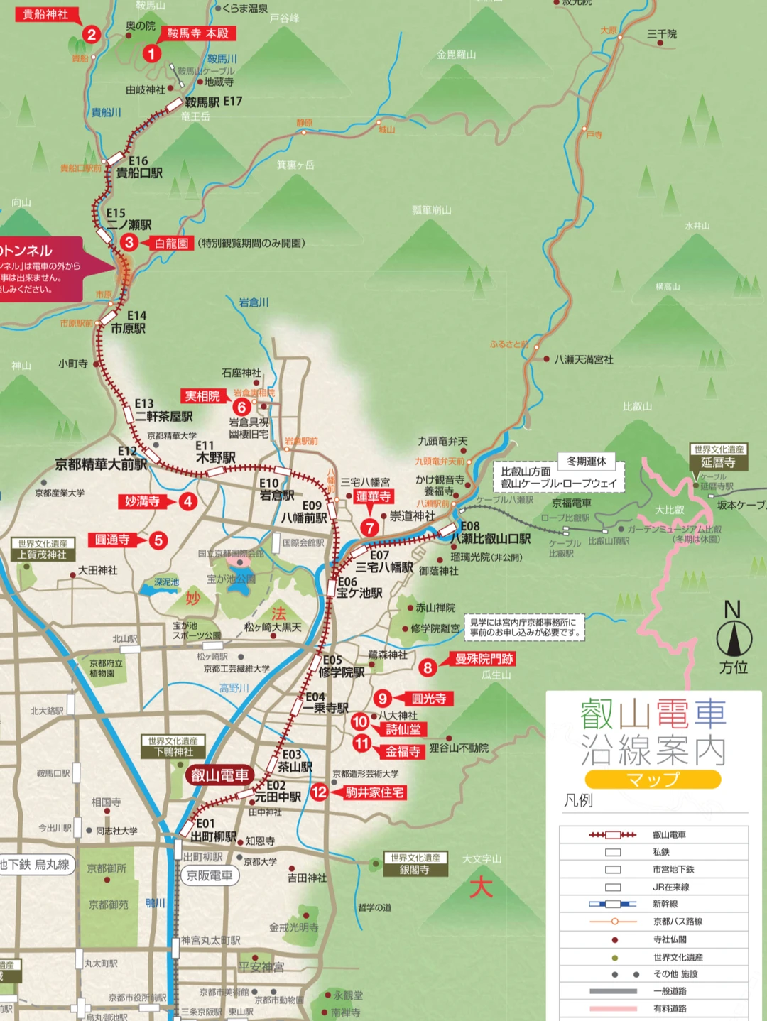 🚃 叡山電車 もみじのトンネル[地点]可以观赏初春的新绿、盛夏的河床纳凉、晚秋的红叶、严冬的雪景,各具风情,美不胜收。有两条不同路线的车