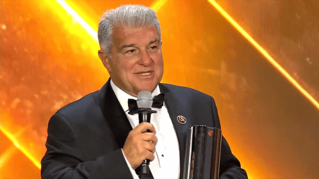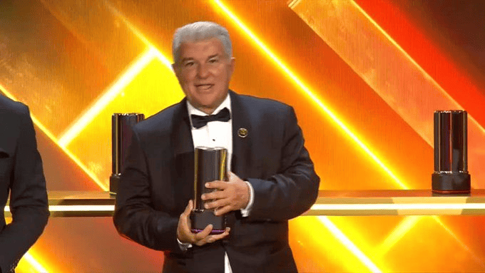 虎扑12月28日讯在今日举行的环球足球奖年度颁奖典礼上,巴萨主席拉波尔塔出席活动,并先后代拉菲尼亚与主帅弗里克领取奖项。他表示,两人的荣誉是球队集体努力的成果,同时强调更衣室层面的领导力、团队精神以及对城市与俱乐部的深度融入,是巴萨过去两个赛季取得成功的重要因素。