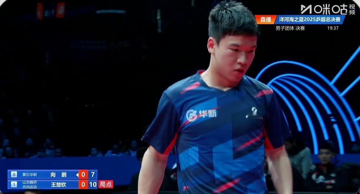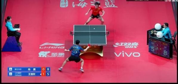 向鹏吃了4个发球,拧丢了7个, 第一局王楚钦11-7先胜向鹏! 这是2025年乒超联赛总决赛男团决赛,山东魏桥对阵黄石基地。 第一盘没有任何悬念,梁靖崑/林昀儒3-0胜了薛飞/刘冠成。 这第二盘期待向鹏能和王楚钦打得有来有回。 咦?还真是,第二局王楚钦7-11被向鹏扳回了[笑哭]! 向鹏配上狂飙龙,这自带神力加持了[吐舌]。