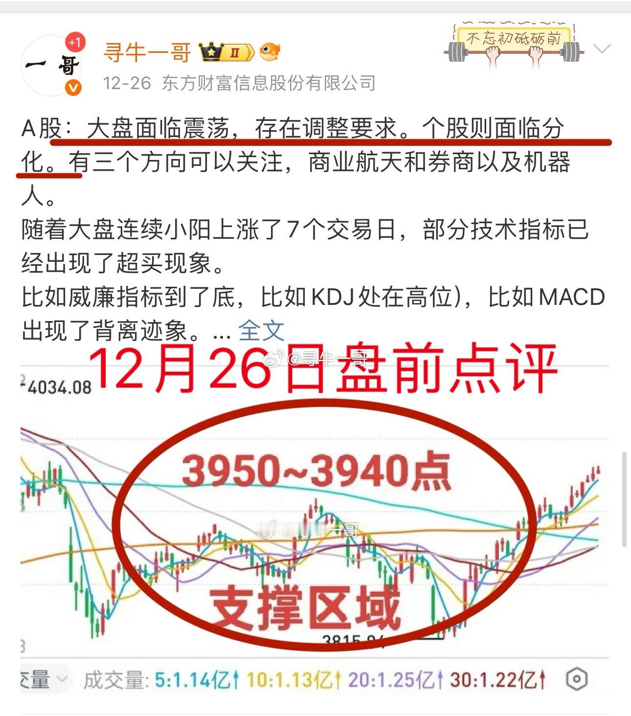 A股:大盘八步赶蝉,下周大盘有希望再创反弹新高。大盘是先抑后扬还是冲高回落呢?有一个关键点是需要注意的。上周大盘连续小阳上涨5个交易日,相继突破了中期均线,30均线和60均线。大盘虽然不能说是气势如虹,也算是步步为“赢”了!目前MA20均线为3898点,MA30均线为3908点。还相差10个点,20均线就可以重新上穿30均线了。上周五大盘盘中出现了震荡,不过最终还是守住了短期均线(MA5均线为3940点),有惊无险。PS:一哥在上周五开盘前有过预测(图),大盘支撑区域为3950~3940点。大盘当天的走势是符合一哥预期的。上周大盘收盘3963点,距离MA10均线3900点有一定距离,大盘继续上涨会有一定压力。大盘如果能够回踩一下,走势会更稳健一些。但是回踩不能踩太深了,3920点一线是要守住的底线!理想的结果,大盘踩到3930点一线止跌,然后反弹。3930点一线,大概是MA10周线区域。上方压力区域依然是3990点一线。周末的消息不少,有利多,也有利空,看看下周初市场如何消化。如果大盘下周初冲高,估计大盘下周收周阴线的概率较大。如果大盘下周初先回踩,大盘下周先抑后扬的机会就大一些。实际上,大盘目前这种震荡格局,投资者不必对大盘的短期走势过于担心。正如一哥上周讲过的那样。这段时间是年前不多的个股交易机会。轻指数,重个股!短线操作,哪里有量,就往哪里去。当然,谨慎追高,把握节奏。个人观点,仅供交流,不构成投资建议!理财有风险,投资需谨慎!a股今日看盘股票大盘行情大盘分析行情A股行情