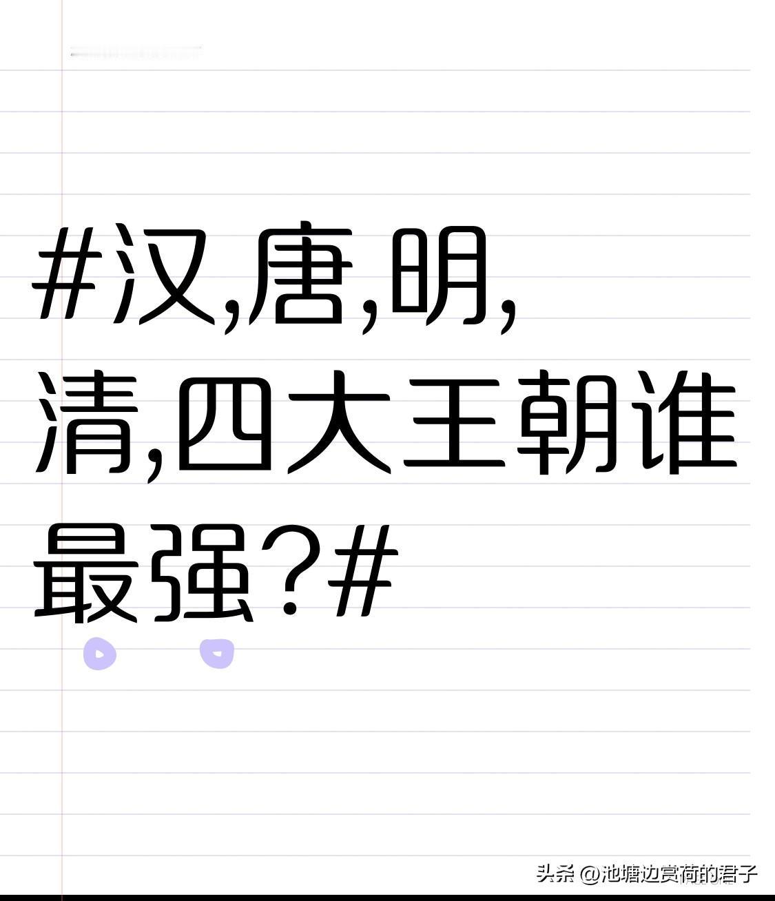 汉,唐,明,清,四大王朝谁最强? 汉、唐、明、清四大王朝谁最强,这事儿还真不好说。 军事上,汉朝卫青、霍去病封狼居胥,将匈奴打得节节败退;唐朝灭东突厥、平高昌,疆域直达咸海。反观明清,明朝后期面对倭寇和后金力不从心,清朝晚清更是割地赔款。 民生与制度方面,汉朝“文景之治”后粮食充足,商贸繁荣;唐朝科举制让人才涌现,“贞观”“开元”时期百姓安居乐业。而明朝八股取士禁锢思想,清朝“康乾盛世”实则民生凋敝还闭关锁国。 每个王朝都有高光时刻和衰落阶段,很难简单评判谁最强,只能说各有千秋。