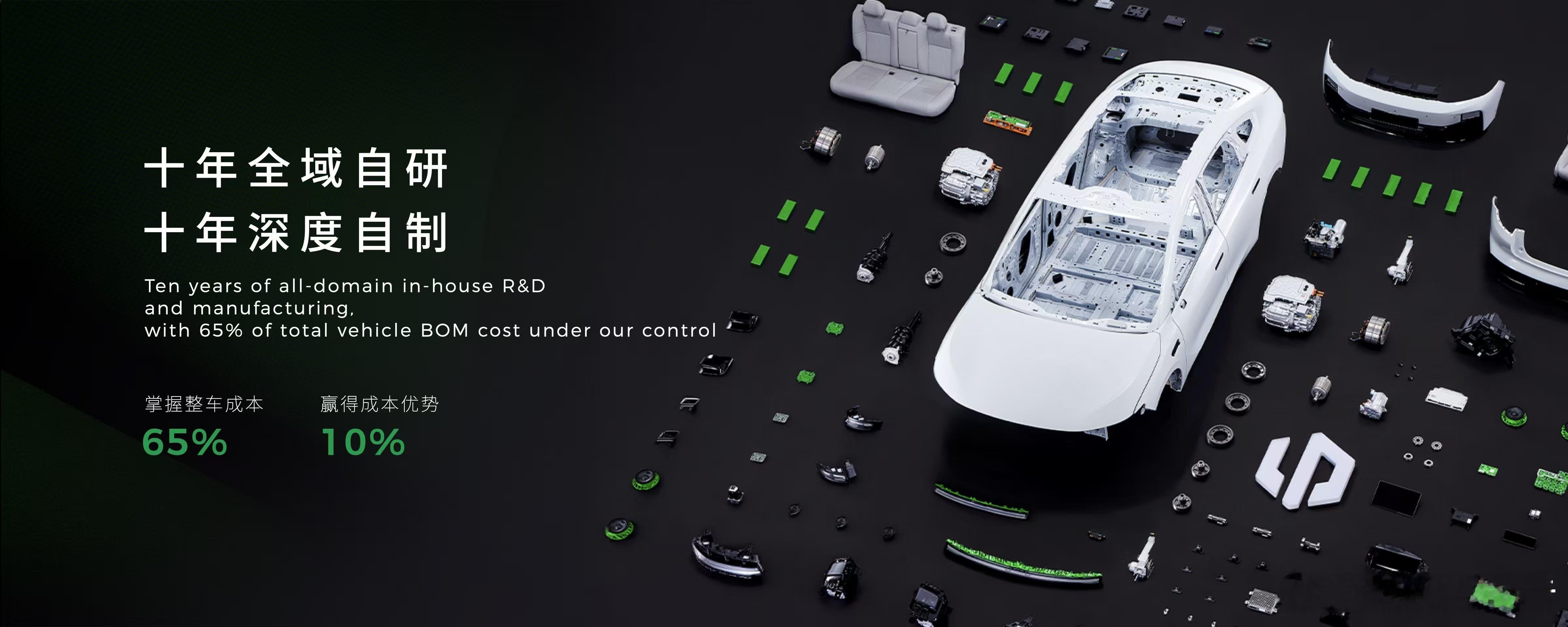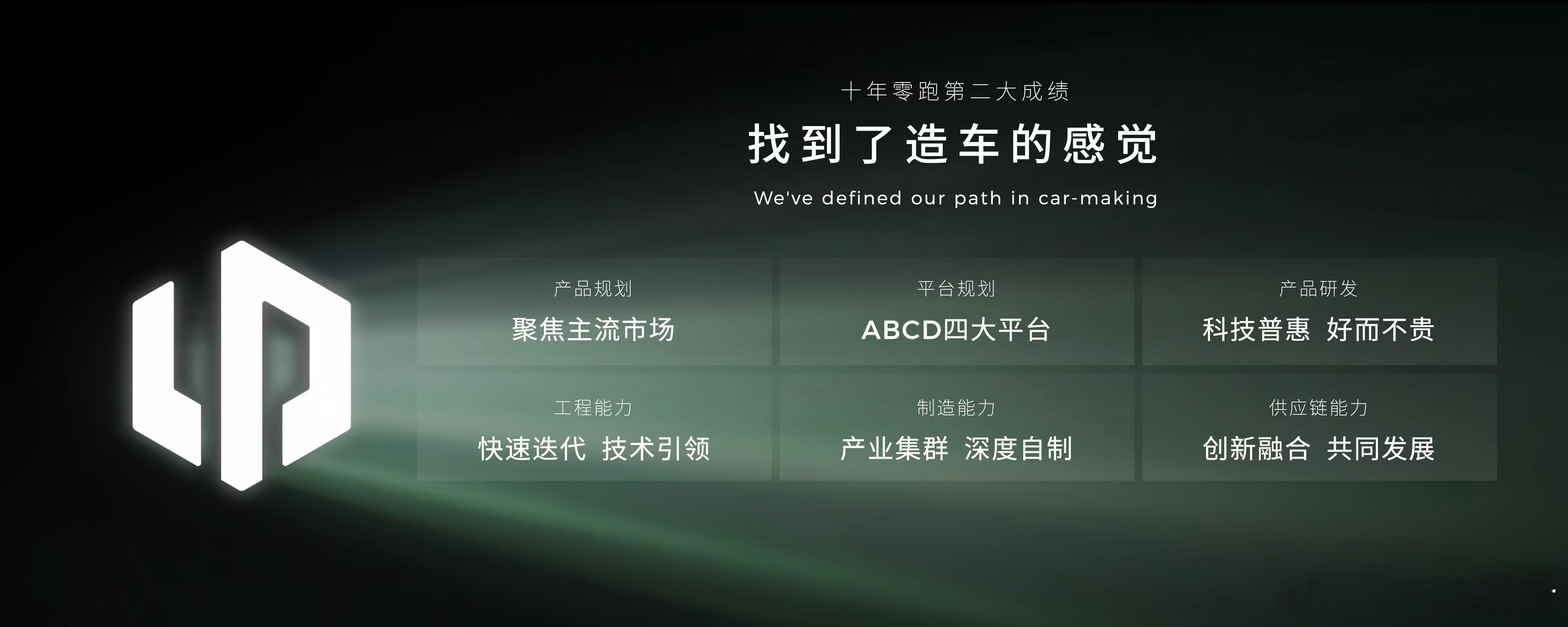 零跑:目标年销400万辆零跑在十周年发布会上宣布,下一个十年目标是年销400万辆,成为世界级智能电动车企。创始人朱江明称,过去十年通过全域自研、深度自制,掌握整车65%成本,获得10%成本优势;已拥有电池、电驱、智算中心等核心技术及自主零部件体系,并确立聚焦主流市场、科技普惠的产品策略,搭建ABCD四大平台。零跑9系豪华双旗舰同台首秀零跑10周年发布会零跑D19零跑D99零跑10年向上领跑零跑的卓越10刻零跑汽车