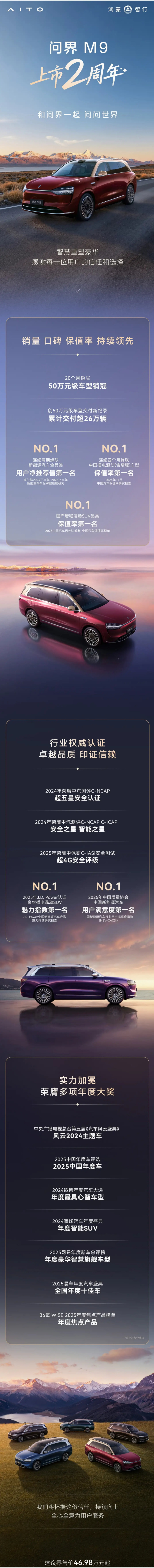 【鸿蒙智行问界M9汽车上市两周年累计交付超26万辆】赛力斯集团副总裁康波发布了鸿蒙智行问界 M9 上市两周年的宣传视频,其中提到问界 M9 上市至今累计交付超 26 万辆。问界汽车官方宣传海报显示 M9 车型取得的成绩如下:20 个月稳居 50 万级车型销冠创 50 万级车型交付新纪录,累计交付超 26 万辆连续两期蝉联新能源汽车全品类用户净推荐值第一名(数据来源《杰兰路 2024 下半年-2025 上半年新能源汽车品牌健康度研究》)连续四个月蝉联中国插电混动(含增程)车型保值率第一名(数据来源《2025 年 11 月中国汽车保值率研究报告》)国产增程混动 SUV 品类保值率第一名(数据来源《2025 中国汽车巴芒达盛典・中国汽车保值率榜单》)在 12 月 9 日的鸿蒙智行年度直播中,赛力斯董事长张兴海总结了问界“5 高”新标准:高安全、高可靠、高性能、高品质、高价值。他表示,问界锚定高端不动摇,要以五高标准,来打造高端汽车。
