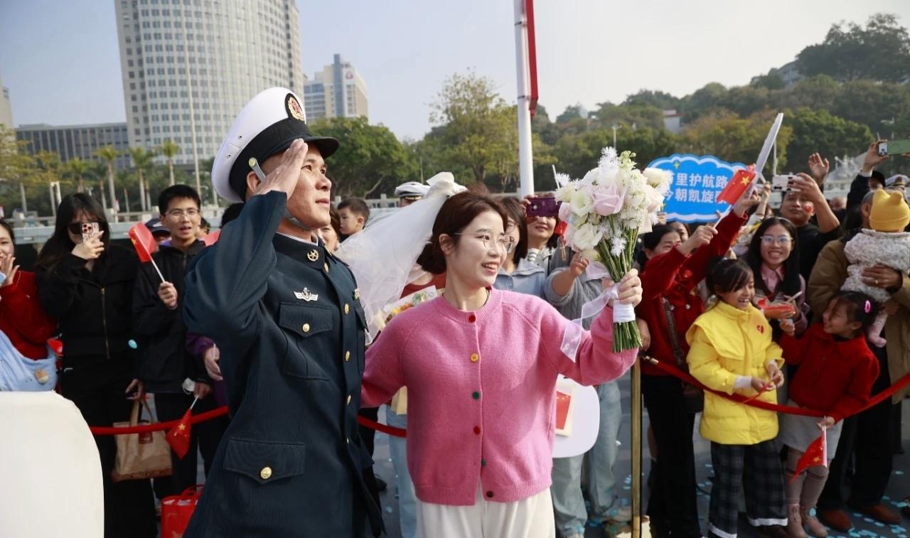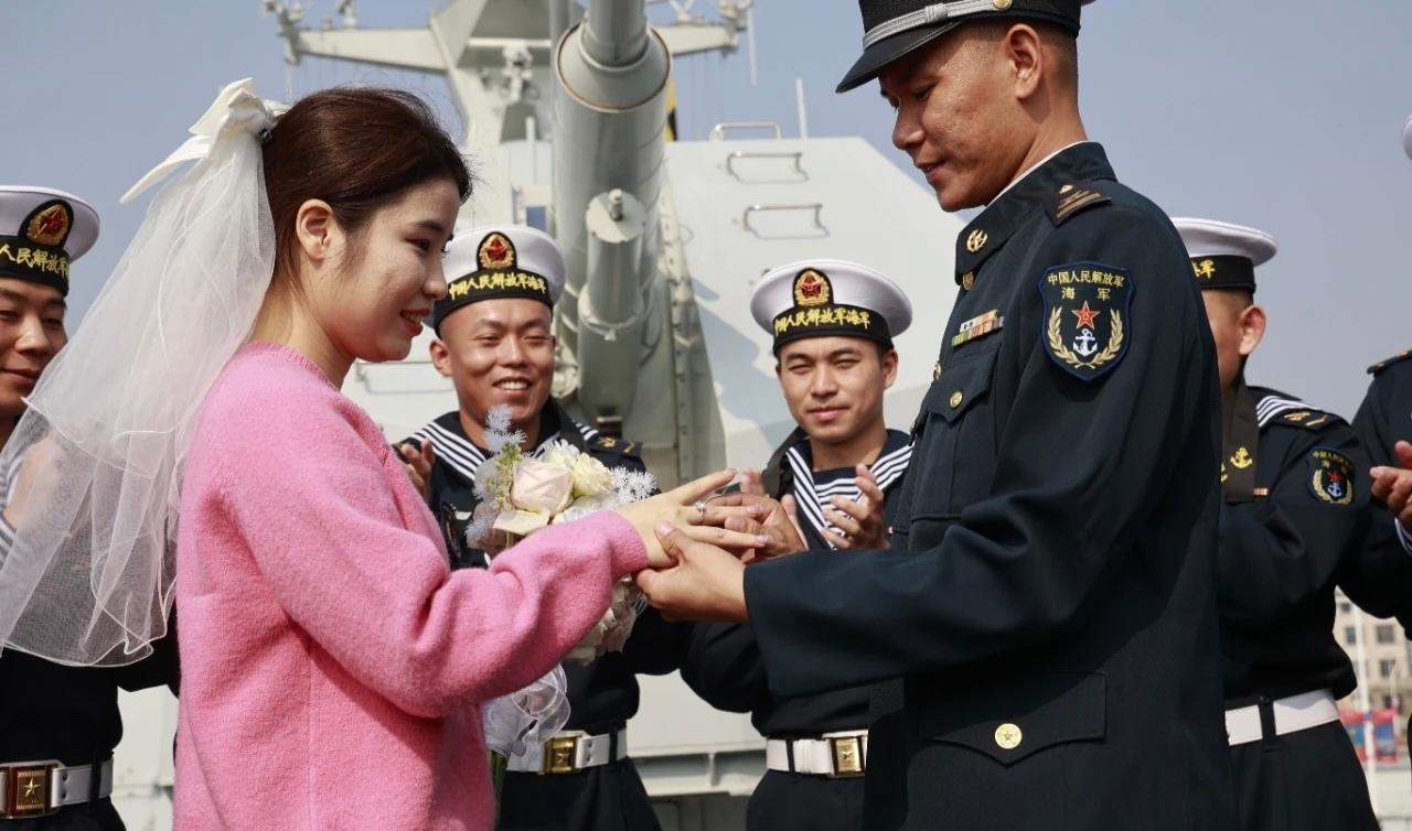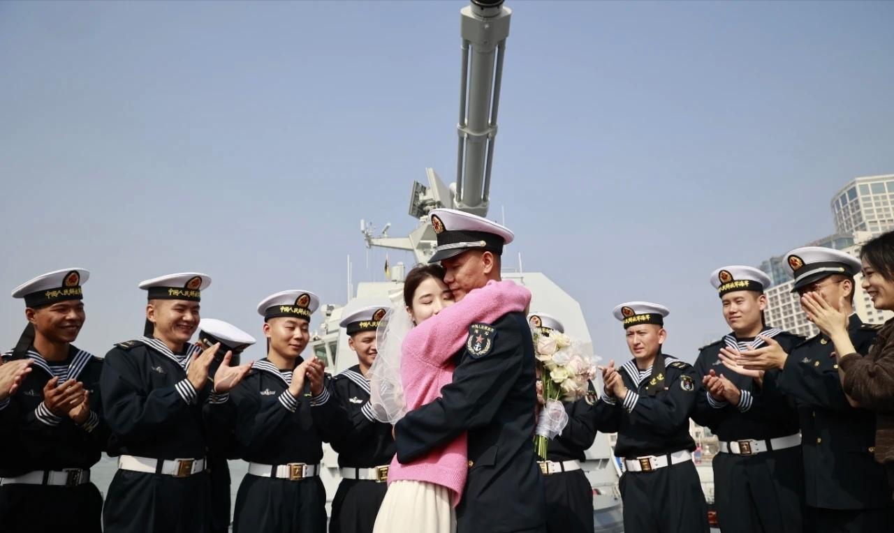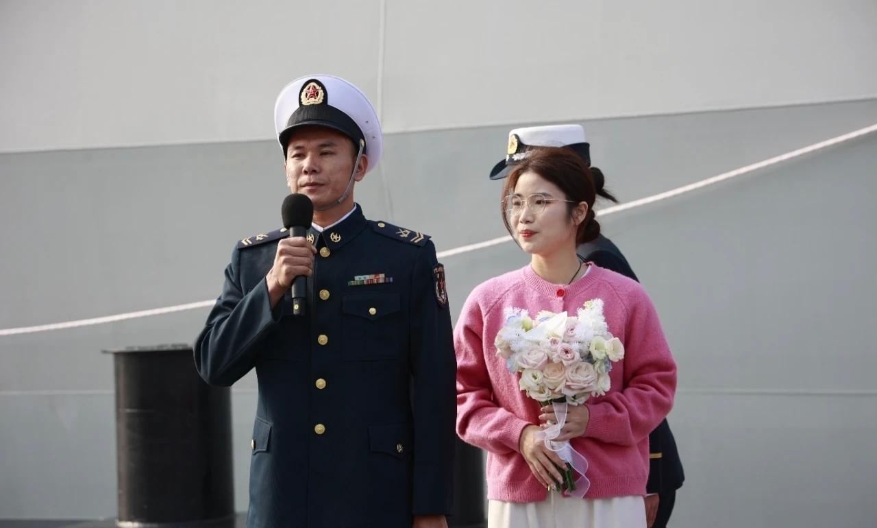在全体官兵和家属的见证下 吴钊与韦夏连双向奔赴 带着368天的思念与期盼 相拥瞬间,一声“老婆我回来了!” 道尽了多少隔海相望的牵挂 让现场不少家属红了眼眶 吴钊牵起韦夏连的手 一步步走向红河舰的舷梯 两侧官兵夹道礼花相迎 祝福声、海浪声、掌声交织在一起 幸福洒满了军港 “老婆,让你等了368天 今天我想在战友们的见证下 给你一个家” 吴钊带着略微的激动和颤抖 向心上人求婚 韦夏连含泪点头 在官兵的欢呼声中 这对新人正式迈入婚姻的殿堂军婚致敬中国军人 创作者中心