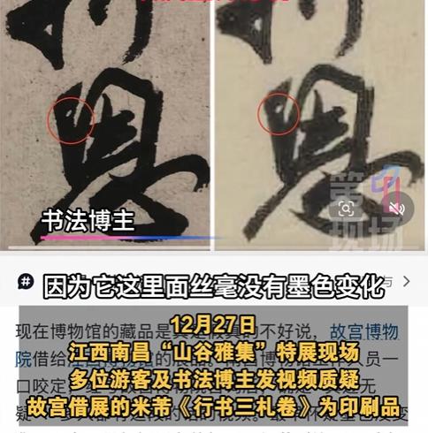 2025 年底文博圈最大争议!江西博物馆黄庭坚诞辰 980 周年特展,彻底闹得沸沸扬扬! 为期 3 个月的特展,号称展出 6 件宋代真迹,除了三件黄庭坚名卷,还有从故宫借展的米芾《行书三札卷》。消息一出,全国各地书法爱好者慕名奔来,就为一睹千年墨宝风采。可谁料,有书法大神现场观展后,直接报警质疑这幅米芾真迹是假的! 大神当场指出三大硬伤:墨色均匀无半点枯润变化,压根没有真迹的质感;字居然盖在印章上面,违背书画创作常识;就连纸张上的窟窿大小,都和网传真迹图对不上。现场争执不下,警方也赶来协调。 面对质疑,江博拍胸脯说作品是从故宫真借的,故宫也坚称借出去的是真迹。可江西博发声明只说 “是原件”,却对三大疑点避而不答。网友灵魂拷问:要么故宫藏假,要么江博偷梁换柱,总不能俩博物馆都没错吧? 国宝不是糊涂账,文博公信力更容不得含糊。这场 2025 年底的博物馆 “期末考”,别靠声明搪塞,拿实锤回应才是正解!