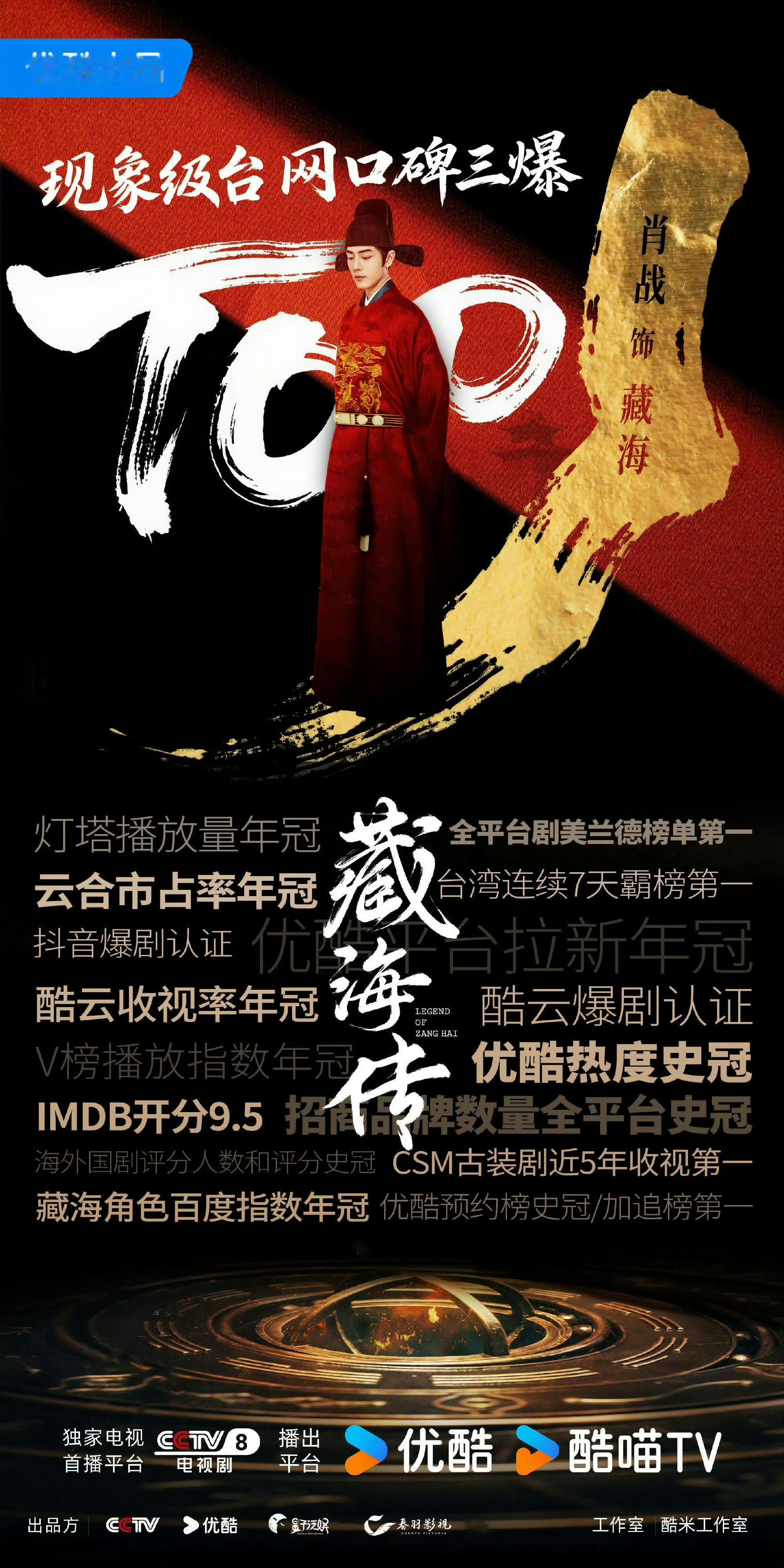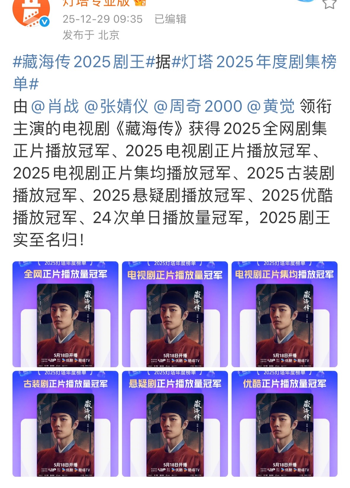 藏海传2025剧王藏海传2025全网播放冠军恭喜肖战藏海传获得各种榜单冠军,七冠王!而他的电影得闲谨制也是口碑票房双爆,2025年是肖战的丰收年啊!