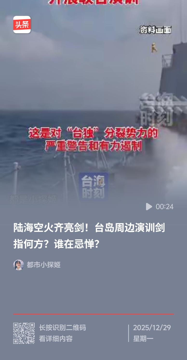 东部战区这次“正义使命 - 2025”演习太提气了!12月29日起,陆军、海军、空军、火箭军等兵力齐上阵,在台湾海峡及台岛周边多个方位展开行动。舰机多向抵近台岛,诸军兵种联合突击,海空兵力还实施环台岛战备警巡。演练的科目包括海空战备警巡、夺取综合制权等。这可不是简单的演习,是对“台独”分裂势力和外部干涉势力的严重警告。咱就是要让那些妄图搞分裂的人知道,捍卫国家主权、维护国家统一,解放军有足够的实力和决心! 中国战区 中国军事演习 硬核东部战区