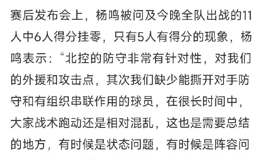 杨鸣话语中透露赵继伟的重要性!此刻无比想念赵继伟吧! 在对阵北控赛后杨鸣指导心态很平和,但是显得很无奈,他表示,球队很长一段时间战术跑的很混乱,这也是很多球员得分挂零的原因,因为没有得分机会,除了付豪,基本都是外援的强解! 战术跑的的混乱无疑是在说球队没有组织核心,也就是缺少赵继伟带来的弊端!此刻杨鸣无比想念赵继伟吧!