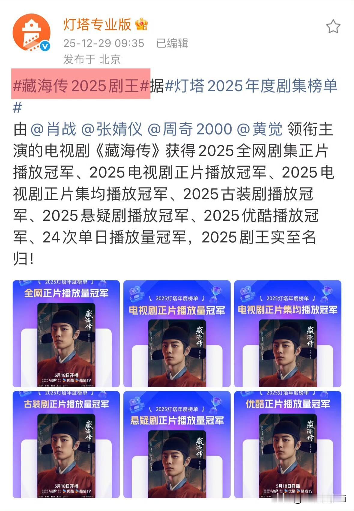 数据平台灯塔和淘票票官方认证肖战《藏海传》2025年剧王[赞] 《藏海传》是几十年难遇的,数据热度口碑三爆,而且艺术价值,社会价值和文化输出价值拉满的一部剧,当之无愧国剧标杆,文化输出名片[赞][赞]