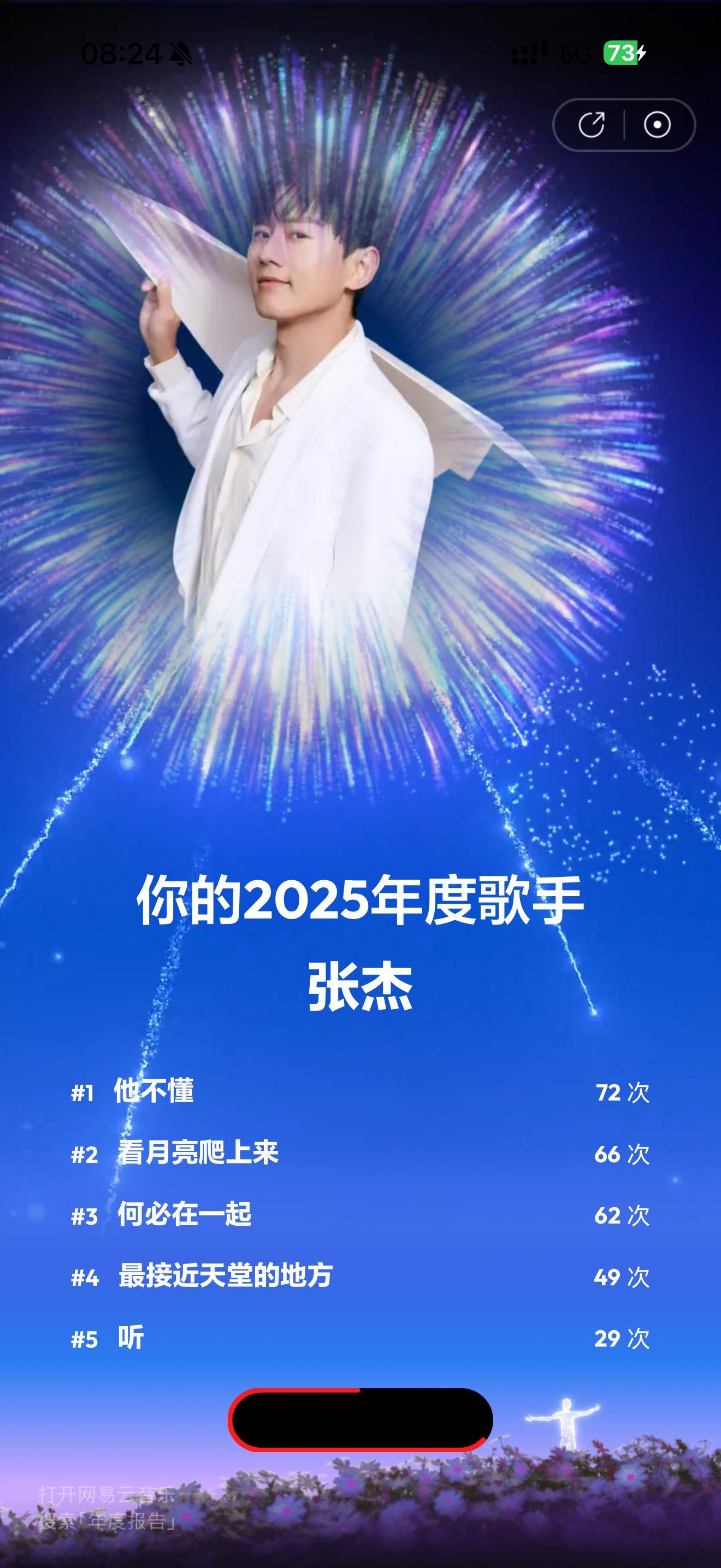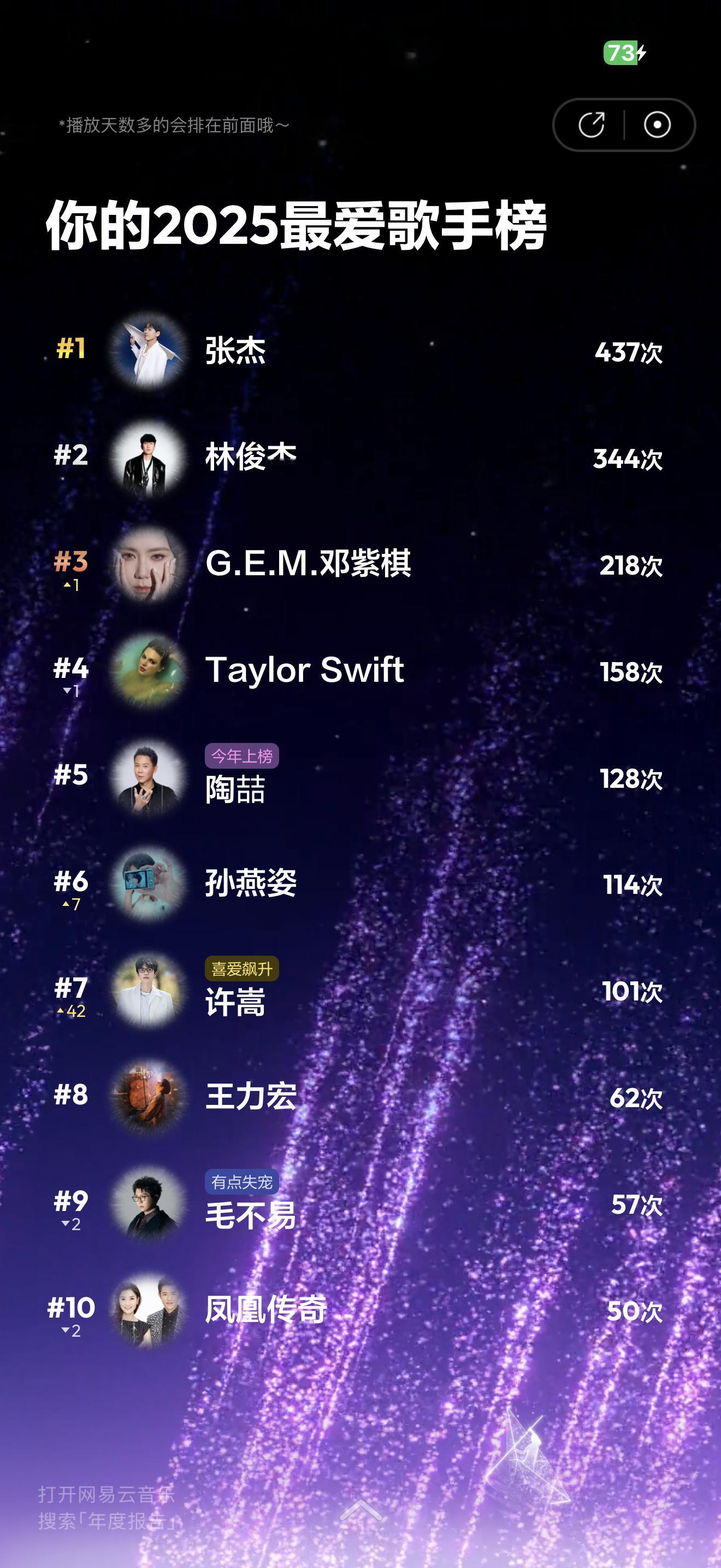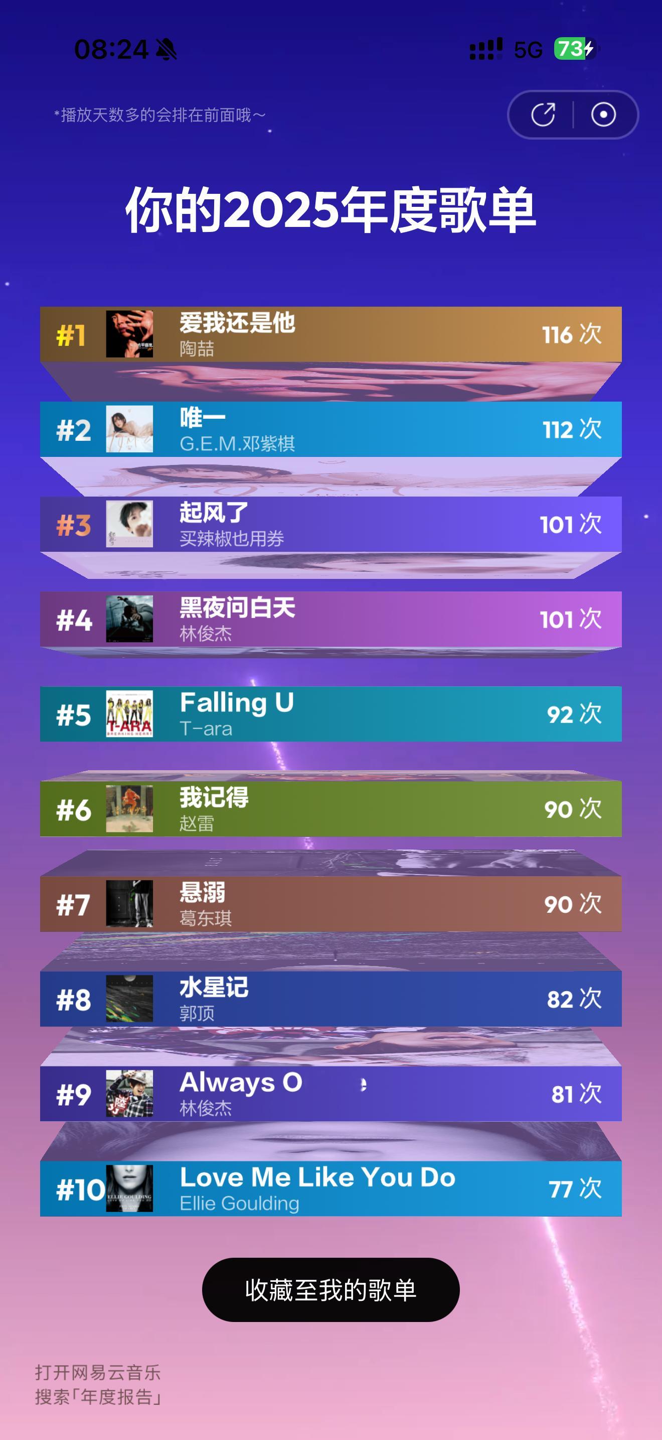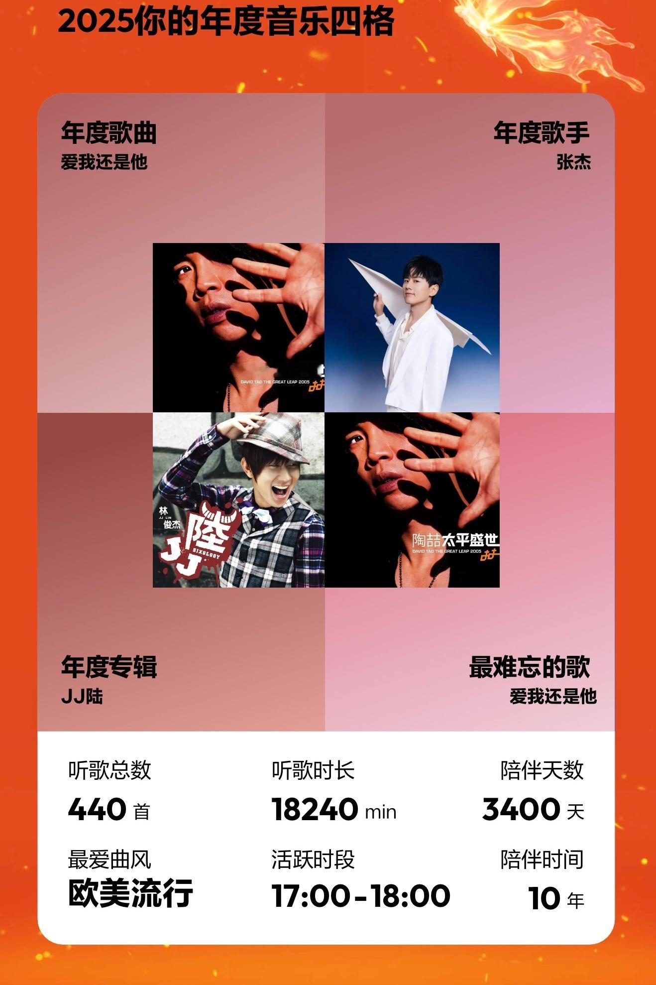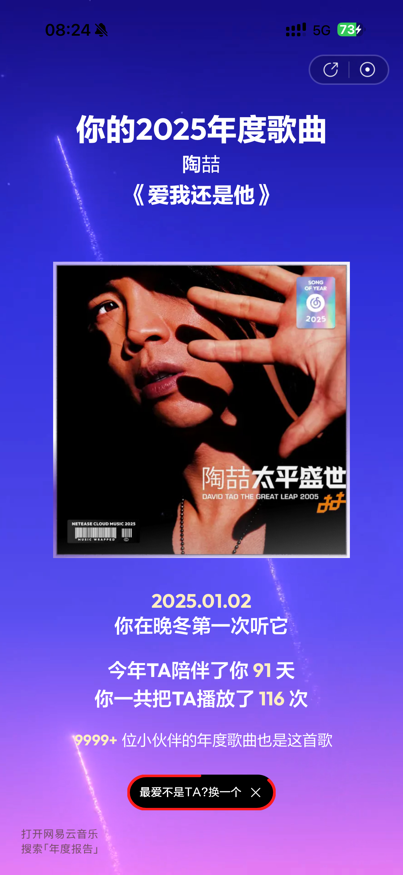 我的2025年度歌曲陶喆《爱我还是他》,最喜欢的歌手张杰。邓紫棋的《唯一》有段时间天天晚上睡前听。网易云年度听歌报告