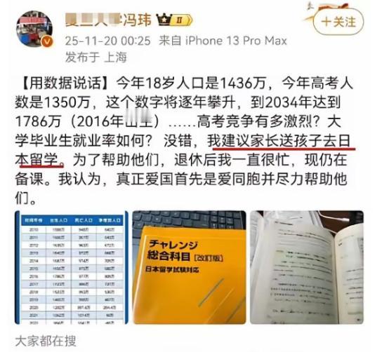 中方呼吁谨慎前往日本,然而复旦大学的冯玮却在此时,高调推荐中国学生去日本,并把这种与中国政府叫板的行径称之为“爱国”,这真是爱国被黑的最严重的一次! 11 月 7 日她在国会公然放话,说要是大陆对台湾动武,可能构成日本的 “存亡危机事态”,到时候自卫队能行使集体自卫权。 这话说出来,不光咱们中国炸了锅,连日本自己人都觉得荒唐,上百民众跑到首相官邸前喊 “高市下台”,冲绳反战团体直接警告 “别把日本拖进战争”。 中方的反应那叫一个迅速。11 月 14 日,外交部和驻日使领馆直接发了提醒,明说 “近期避免前往日本”,理由很实在:不光政治氛围紧张,针对中国公民的违法案件也多了,好些案子至今没破。 紧跟着教育部也发了留学预警,劝大家谨慎规划赴日安排;国航、东航这些航司干脆开放了日本航线免费退改,短短十天就有 12 条航线全停了。说白了,这不是不让去,是真为老百姓的安全操心。 可就在这节骨眼上,复旦大学退休教授冯玮偏偏要唱反调。刚办完退休手续,他就扎进留学中介的直播间,对着镜头拍胸脯:“别怕,去日本留学挺好的,学技术回来能报效国家!” 更离谱的是,他还把这跟政府唱反调的行径,硬说成是 “爱国行为”。这操作看得人一愣一愣的 —— 爱国啥时候成了跟国家安全提醒对着干的理由? 要我说,冯玮这 “爱国” 论调,纯属挂羊头卖狗肉。先不说他推荐留学的时机多微妙,单看他过往的言论,就知道这人的历史观早歪了。 他明明说自己爷爷是淞沪会战的老兵,转头却在电视节目里说南京大屠杀是 “误杀”,还扯什么 “要是当时中国主动投降,就不会有大屠杀”。 更荒唐的是,他把卢沟桥事变说成 “中方不让日军进城搜人引发的小打小闹”,这话后来还被日本右翼纪录片当成 “论据” 引用。现在高市早苗正拿着歪曲历史当政治资本,冯玮倒好,帮着把侵略历史洗白,这叫哪门子爱国? 更可疑的是他跟留学中介的那点瓜葛。直播里他不光推荐学校,还教学生 “怎么绕开历史敏感话题”,明摆着是给中介站台带货。 要知道他可是复旦的博士,还在日本庆应大学当过客座教授,拿着国家培养的学术资源,退休了不搞研究,反倒靠歪曲历史赚留学中介的钱,这吃相也太难看了。 有网友扒出来,他以前就总夸国民政府抗日 “更厉害”,对八路军的贡献绝口不提,甚至说抗美援朝 “不该打”,把美国吹成 “和平守护者”。这哪是学者该有的样子?分明是拿着学术头衔当敛财工具。 冯玮嘴里的 “学技术报效国家”,压根经不起推敲。现在中日在绿色发展、汽车制造这些领域早有官方合作,3 月份第六次中日经济高层对话刚签了二十项共识,里面明确说要办中日汽车对话、节能环保论坛,真要学技术,通过官方渠道有的是正经门路。 何况现在日本的安全环境摆那儿,外交部都提醒 “人身安全有重大风险” 了,他还怂恿学生往风险里钻,这哪是为学生着想,分明是拿年轻人的安全换自己的佣金。 其实爱国这事儿从来不是喊口号,更不是跟国家对着干。剑桥大学有篇研究说得好,真正的爱国得有 “包容性” 和 “批判性忠诚”,既爱自己的国家,也得尊重历史事实,更得顾全国家利益。 冯玮倒好,一边靠着复旦教授的头衔享受荣誉,一边帮着日本右翼歪曲历史;一边拿 “报效国家” 当幌子,一边给留学中介站台赚钱。这种把爱国当生意做的套路,简直是往 “爱国” 俩字上泼脏水。 现在这事已经闹大了,教育部在查学术不端,复旦大学也表态要彻查。网友说得好:“学者可以有不同观点,但不能没有底线;可以推荐留学,但不能无视安全;可以研究日本,但不能歪曲历史。” 冯玮要是真为学生好,真懂爱国,就该先把自己那套歪理掰正了,好好讲讲淞沪会战的惨烈,说说南京大屠杀的真相,而不是拿着爷爷的抗日经历给自己贴金,转头又帮着侵略者洗白。 说到底,爱国从来不是投机取巧的借口。高市早苗的谬论挡不住中日民间的理性交流,但冯玮这种借着爱国名头谋私利的行为,必须好好管管。 不然今天有人拿 “留学” 当幌子歪曲历史,明天就可能有人拿 “交流” 当借口损害国家利益。真爱国,得先守得住历史底线,掂得清安全分量,这道理,冯玮这教授怕是白当了。