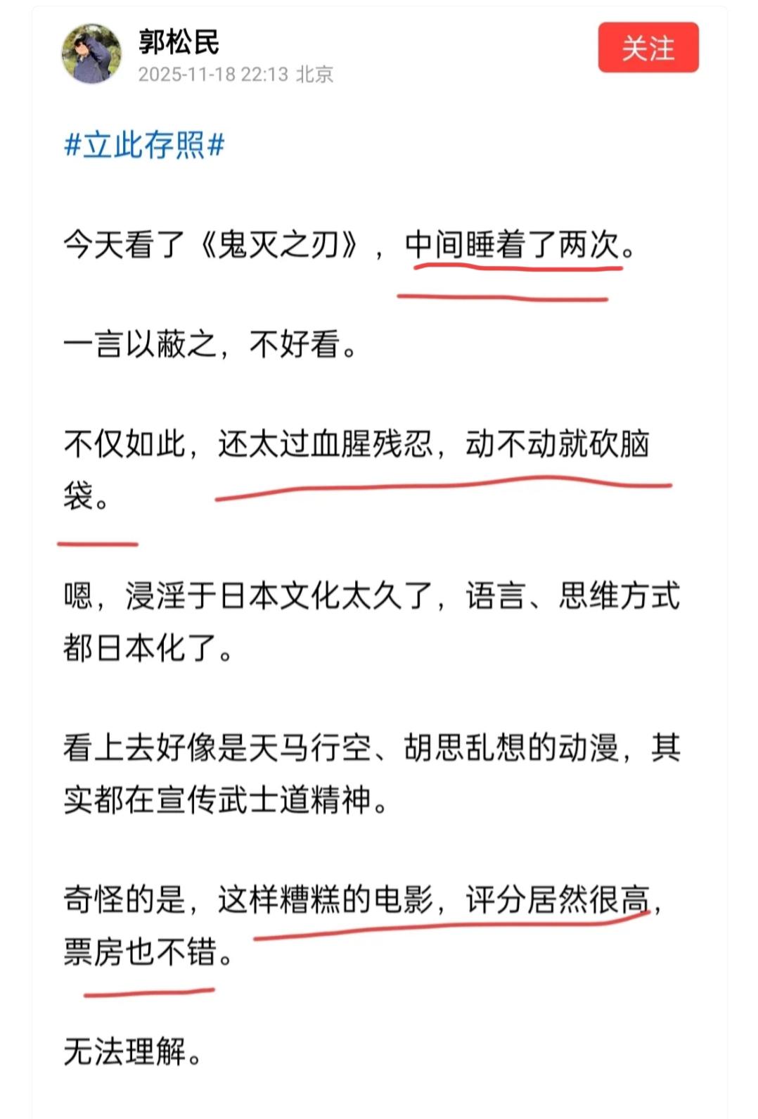 卢克文与郭松民评外国电影有一相似点。 卢克文看完《阿凡达3》电影后,他说他的感觉是疲倦、累。 与此相似的是,郭松民看完《鬼灭之刃》后,他说他中间睡着了两次。 两位先生都认为自己看的电影很差,所以他们在生理上出现了消极的反应,虽然他们不是专业的影评人,但还是向网友们说出了自己的真实感觉。 一部电影是好是坏?就是要通过大众的整体观感来说明的,大部分人的观感很好,那就说明这部电影还不错,反之,那就不咋地了。