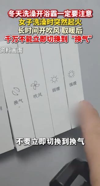 “悲剧还是发生了!”近日,安徽,一女子刚洗完澡,就把浴霸的“暖风”切换成了“换气”,结果还没出卫生间,浴霸就传来“砰”的一声闷响,随后火花如流星般飘落!吓得女子拔腿就跑。网友:洗澡的时候不是全都开着吗? “悲剧还是发生了!”近日安徽一位女子家中发生的一幕,让不少网友看完后后背发凉。 据了解,这位女子当天晚上下班后,想洗个热水澡放松一下。她提前把浴霸的暖风打开,等卫生间暖透了才进去。 舒舒服服洗完澡后,她擦干身子,顺手就把浴霸的暖风档切换到了换气档,想着把浴室里的水汽排干净。 结果脚还没迈出卫生间门,头顶就传来“砰”的一声闷响。 这一声巨响把她吓了一跳,回头一看,更吓人的场景出现了,浴霸里不断噼里啪啦作响,火花像流星一样往下掉。 女子吓得魂都飞了,本能地拔腿就往外面跑,第一时间就拉了家里的总电闸。 等心跳稍微平复下来,她赶紧接了水把浴霸的火泼灭,还好发现及时,火势没蔓延开,也没造成人员受伤。 这件事传到网上后,不少网友都炸了锅,有人留言说“洗澡的时候我都是暖风和换气一起开,原来这么危险”,还有人疑惑“切换个模式而已,怎么会突然爆炸”。 其实不光是这位网友,很多人用浴霸都有类似的习惯,觉得这样又暖和又能排湿气,却不知道背后藏着安全隐患。 说白了,浴霸突然出问题,大概率和使用方式以及设备本身状态有关。 后来有维修工看完情况后分析,很多浴霸的暖风和换气功能并不是完全独立的,内部会共享线路和电机。 这位女子当时已经开了挺长时间的暖风,设备处于高温运行状态,这时候突然切换到换气模式,温差和电流变化叠加在一起,就很容易引发故障,出现巨响和火花。 除了使用习惯,还有两个点也不能忽视,一是浴霸的质量,要是买的是杂牌产品,线路混乱、零部件以次充好,阻燃和耐温性能不达标,高温环境下就容易出问题。 二是超龄服役,任何电器都有使用年限,浴霸用久了线路和零部件会老化,哪怕平时用得小心,也可能突然“罢工”引发危险。 可能有人会说,那以后用浴霸该怎么注意? 其实也不难,稍微留意几个细节就行。洗澡前提前开暖风预热,别长时间开着;切换模式的时候,最好等设备冷却一会儿再操作,别刚关暖风就开换气。 还有就是定期检查一下浴霸的线路和插头,看看有没有老化、损坏的情况,要是用了好几年了,性能下降就赶紧换新的。 另外要提醒一句,万一真遇到浴霸起火的情况,千万别像有些人为了图方便直接泼水,那样很可能导致浴霸炸裂,火花飞溅得更厉害。 正确的做法是先拉总电闸断电,火势小的话用干粉灭火器扑灭,要是控制不住就赶紧撤离,然后打119报警。 冬天洗澡图暖和是刚需,但安全永远是第一位的,家里有浴霸的,不妨现在就检查一下自家的设备,也把这些使用注意事项记下来。 毕竟意外都是在不经意间发生的,多一分小心,就能少一分风险。 对此您有什么不同的看法,可以在评论区留言讨论!!!
