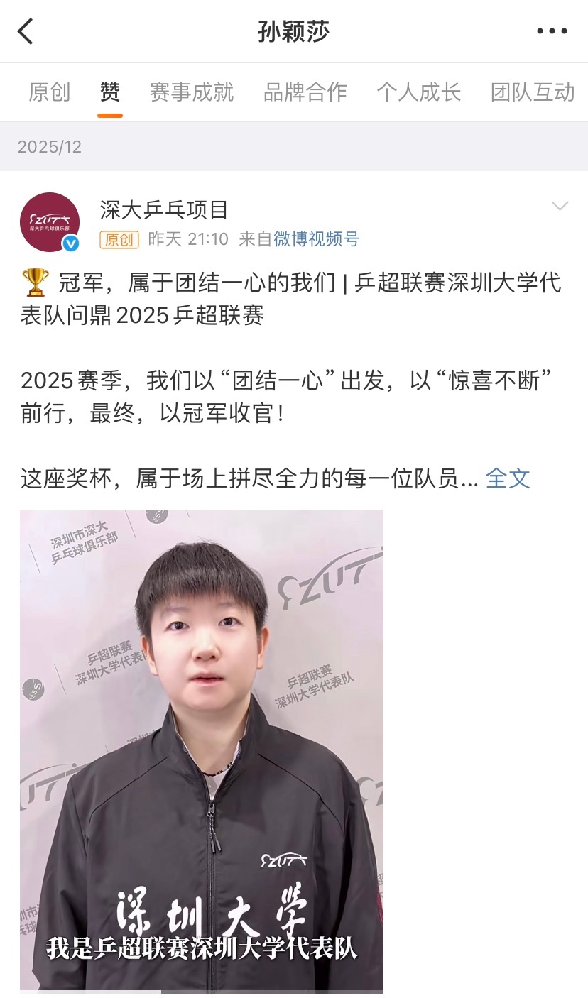孙颖莎第一时间祝福女团夺冠在终场哨响、冠军尘埃落定后的第一时间,她的祝贺视频便已
