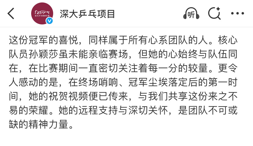 孙颖莎第一时间祝福女团夺冠在终场哨响、冠军尘埃落定后的第一时间,她的祝贺视频便已