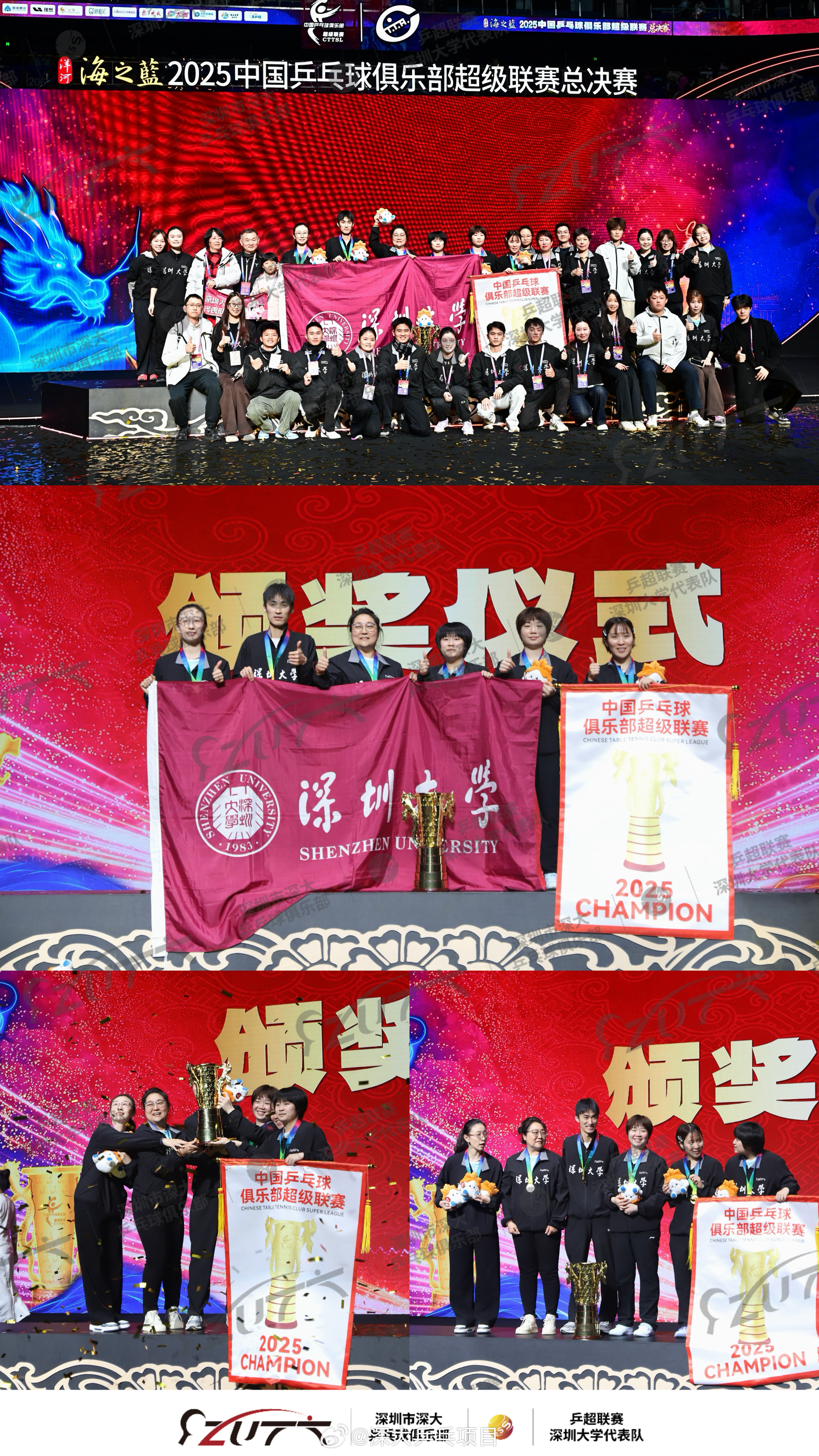 #深圳大学乒超总决赛plog# 2025赛季乒超联赛女子团体总决赛,深圳大学代表队3-1力克山东鲁能,第三次加冕联赛女团冠军晒出plog:回首九载征程,七次决赛舞台的拼搏,三次冠军荣耀的洗礼,这座“凤杯”是对过往所有坚持与汗水的最佳褒奖。它属于在赛场上拼尽全力的运动员,属于在幕后辛勤付出的教练组与保障团队,更属于每一位一路相伴、呐喊助威的师生、校友与球迷。荣耀已成过往,未来更为可期。乒超联赛深圳大学代表队和深圳市深大乒乓球俱乐部将继续肩负使命,在传播国球文化、培育后备人才的道路上坚定前行,为深圳大学增添一抹昂扬的体育亮色#深圳大学乒超女团夺冠#