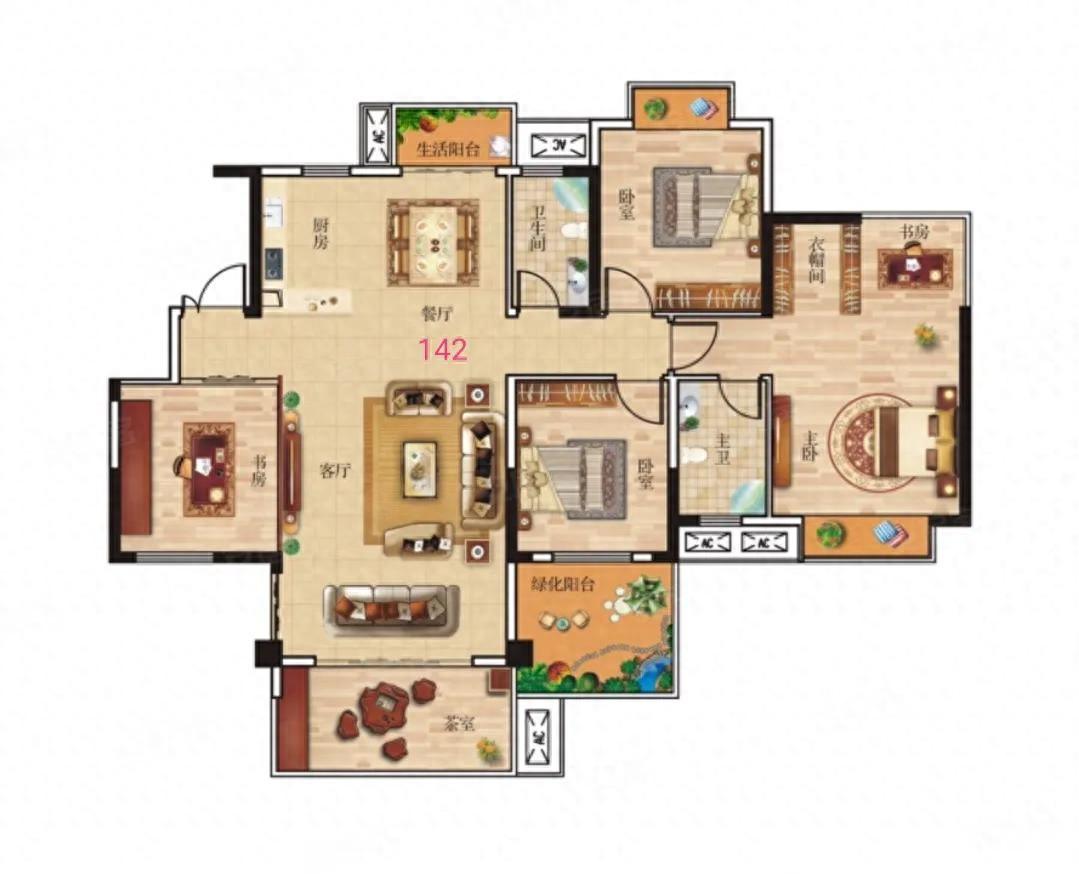 可能吧,这是一款普通141.96㎡的房子,但是它非常有诚意,因为你要知道它配置了四个卧室,南向的中间的卧室配置了一个高度达到两层的绿化阳台,甚至吸取了很多第四代住宅的优点和精髓。 厨房,餐厅,客厅几乎形成了一体化的效果,不得不说这房子完全可以一步到位。