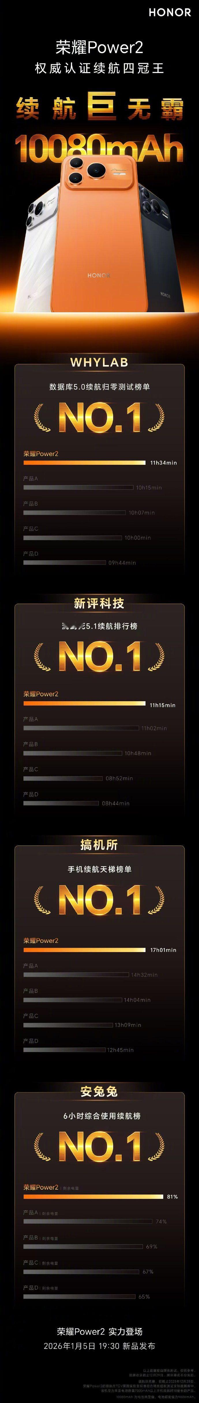 荣耀Power2获四家权威媒体榜单续航NO.1大家说明年这个时候的新机,续航能达到多少?