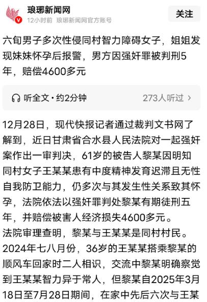 “缺大德了!”甘肃合水,61岁男子发现34岁女子智力异于常人,起了歹念,4个月内,男子在家中6次与女子发生关系,结果,女子怀孕了,被姐姐发现后报警,而后,姐姐带着妹妹去医院做了流产手术,最终,男子为此受到了法律的严惩! 涉案的两人都是合水县一个村子的,男方叫黎某,案发时61岁;女方叫王某某,今年36岁,患有中度精神发育迟滞,反应迟钝、表达也不清楚,根本没法像正常人一样分辨是非。 两人的交集始于2024年七八月份,那天王某某搭了黎某的顺风车回家,就这一路的交流,黎某就明显察觉到王某某智力异于常人。 换作正常人,顶多会多留意下这个特殊的同村人,可黎某心里却生了恶念。 他算准了王某某不懂反抗,也没法清晰诉说遭遇,从2025年3月18日开始,屡次引诱王某某去自己家里,直到7月28日这四个多月里,先后六次和她发生了性关系。 纸终究包不住火,2025年8月初,王某某的姐姐发现妹妹状态不对劲,不仅精神萎靡,肚子还慢慢鼓了起来。 姐姐赶紧追问情况,可王某某支支吾吾说不出完整的话。 姐姐心里一紧,立马带妹妹去医院检查,结果出来的那一刻,她彻底崩溃了,王某某怀孕了。 姐姐比谁都清楚,妹妹的智力状况根本不可能自主恋爱怀孕,肯定是遭了欺负。 于是强压着心疼和怒火,她当即就报了警。 8月12日,黎某就因涉嫌强奸罪被警方刑事拘留,第二天,王某某在医院做了人工流产手术,这场不该到来的怀孕,终究以痛苦的方式落幕,可给她留下的创伤却难以愈合。 案件侦查期间,司法鉴定机构给出了明确结果:王某某患有中度精神发育迟滞,在这起案件的性行为中,不具备性自我防卫能力。 说白了,她根本不懂性行为的性质和后果,就算没有激烈反抗,也不能算“同意”。 同年11月3日,合水县法院立案审理了这起案子。考虑到涉及个人隐私,法院实行了不公开开庭。 庭审时,黎某倒是没狡辩,对指控的事实和罪名都没异议,自愿认罪认罚。 不过他的辩护人曾提出质疑,说不认可无性防卫能力的鉴定意见,还怀疑是否违背妇女意志。 但法院的认定很明确,王某某因为智力缺陷属于“不知反抗”的情形,黎某早就知道她智力异常,还故意实施侵害,不管她有没有反抗动作,都已经违背了妇女意志,完全构成强奸罪。 最终综合黎某坦白、认罪认罚的从宽情节,法院判处他有期徒刑五年,还要赔偿王某某经济损失4600多元。 这起案子虽然尘埃落定,黎某也付出了代价,但想起来还是让人揪心。 王某某本就是需要被呵护的弱势群体,连基本的自我保护能力都没有,可黎某作为同村长辈,不仅不关照,反而趁虚而入,这种行为既违背了公序良俗,更触碰了法律红线。 其实这案子也给咱们提了个醒,农村里的智力障碍群体可能更容易成为侵害目标,家人得多上心看护,周边邻居要是发现异常也该多搭把手。 法律从来不会因为被害人有缺陷就忽视她们的权益,只要敢伸手侵害弱势群体,不管手段多隐蔽,最终都逃不过法律的严惩。 对此你有什么不同的看法,可以在评论区留言讨论!!!