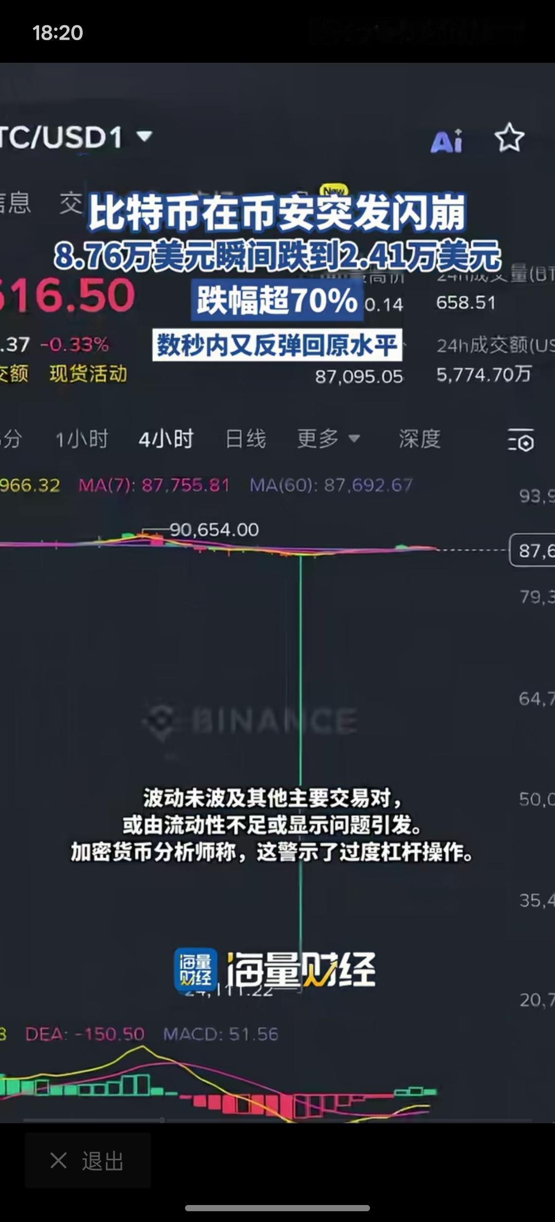 今天,比特币盘中直接闪崩,从8万多美元直接瞬间跌到了2万多美元,这是什么样的神操作?完全就是在告诉你,比特币可以瞬间崩盘,只要允许,比特币完全就是资本的游戏,这种恐怖的程度非常可怕,炒比特币的真的是可以让你财富瞬间就清零!中国一直控制着不让国内的这些机构,资金甚至普通投资者去炒倍特品,因为比特币,它完全就是一个没有价值锚定的虚拟货币,没有什么可以背书,更加,有国家信用体系的背书,只是资本在推动比特币的操作,所以这种虚拟货币一旦崩盘的话,根本就是血本无归