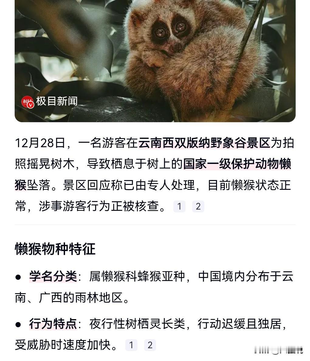 这真的是太没素质了,竟然这样对待国家保护动物,成何体统? 12月28日云南,为了让妻子和懒猴拍照,他竟然疯狂的摇树把懒猴从树上摇下来了。 这可是国家保护动物。 已经对这名游客进行调查了。 作为一个游客最重要的就是守规矩。 要文明要有素质。 这名游客虽然对老婆好,但是不能够建立在这样对待保护动物的基础上。