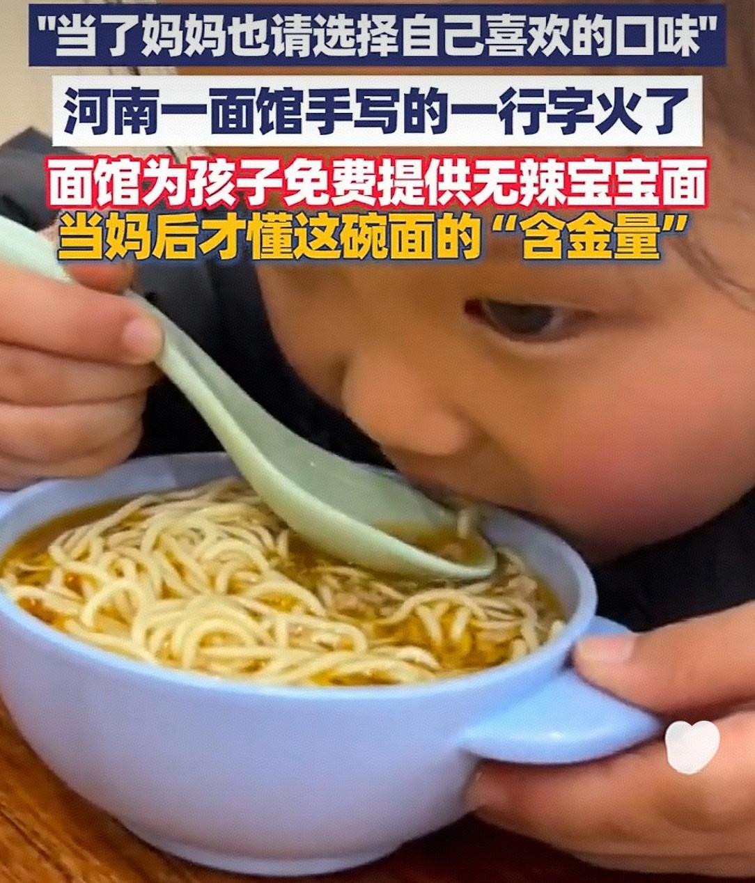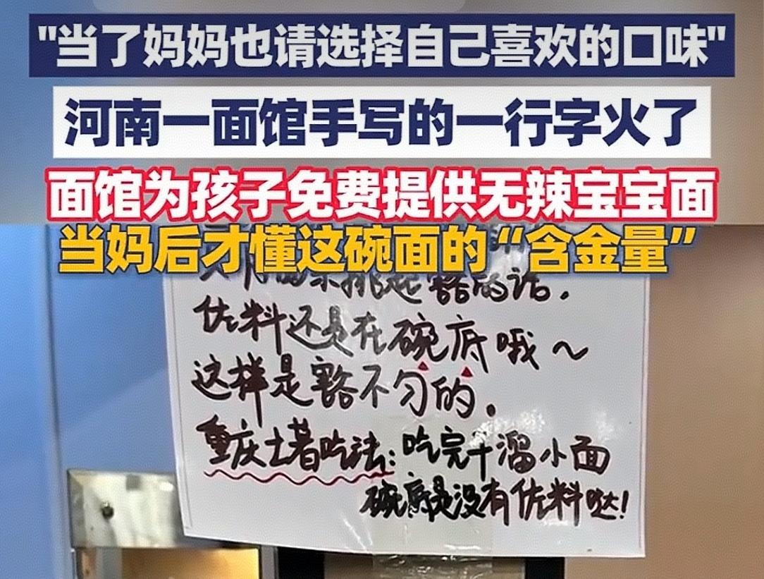 一碗免费宝宝面,一句“妈妈请自选”:这间面馆暖了全网的妈心 当河南焦作这家小面馆挂出“免费提供宝宝面”时,已是一份难得的善意。但真正让无数网友破防、直呼“懂得含金量”的,是后面那句朴素到极致的话:“当了妈妈也请你选择自己喜爱的口味。” 这句话,像一束温柔的光,精准照进了中国妈妈们最隐秘的情感角落。 它击中的,是无数母亲那早已习惯的“自我退让”。从孩子出生那刻起,许多妈妈的口味就自动排到了家庭菜单的末尾。吃饭先考虑孩子爱吃什么、营养如何;点餐时下意识地说“我都行”;“辣的不行,孩子吃不了”、“这个太硬,孩子消化不了”……她们的身份,在“母亲”这一神圣角色中被无限放大,而那个曾经有自己的口味偏好、有小小任性的“自己”,却悄悄缩成了一个影子。 这家面馆的老板,未必是育儿专家,但他一定是生活的观察家,是人性的体悟者。他提供的不仅是一份免费的辅食,更是一份珍贵的 “看见”——他看见了那位抱着孩子的女性,首先是一位需要被照顾、被尊重的个体,然后才是母亲。这碗面,等于轻轻对妈妈说:“孩子很重要,你,也同样重要。” 网友的共鸣如山呼海啸,因为这小小举措,撬动了一个沉重的话题:我们的社会,是否在赞美母亲无私奉献的同时,也无形中剥夺了她们“做自己”的正当空间?这份“懂得”,之所以有含金量,是因为它太稀缺。 这间朴素的面馆,无意中完成了一次温暖的社会实验:真正的关怀,不在于给予多么昂贵的赠品,而在于是否触及了人心深处那份被理解的渴望。 它用一句叮嘱、一个选项,赋予了母亲片刻的选择自由与情感尊严。这种善意,成本极低,却价值连城。 它让我们思考:爱的真谛,是否一定是牺牲与让渡?健康的爱,更应该是一种彼此照亮的循环。 一个被尊重、被呵护的母亲,才能传递出更从容、更丰盈的爱。这家面馆的温暖,正在于它悄悄维护了这个循环的起点。 这个世界的美好,常常就藏在这样不起眼的细节里。它提醒我们所有人:在爱孩子、爱家人的同时,别忘了,那个为你付出一切的妈妈,她也值得被问一句:“今天,你想吃什么口味?” 这份将心比心的体贴,才是送给母亲们最温暖的礼物。一碗面体现出妈妈的温暖。