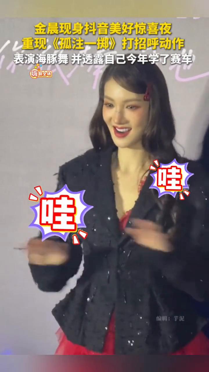 金晨现身抖音美好惊喜夜,重现《孤注一掷》打招呼动作,表演海豚舞并透露自己今年学了赛车。 12月28日浙江杭州。记者:张晗。编辑:芋泥。 希望2026年学一个新的技能,就是赛车。 就点个关注吧。