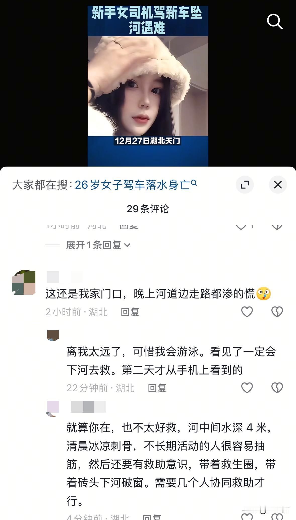 驾车不慎坠河的26岁女车主真的很漂亮!她的新能源车是湖北孝感牌照,其一个人在天门工作。就在前几天,她才告知家人自己买了新车,结果都还没来的及开回家,悲剧就发生了! 12月27日一早,她穿着白鞋黑裤,驾驶着车子出门上班。不料,时间刚刚停在7点的时候,因其操作不当,车子从马路上快速越过了绿化带和人行便道,冲进了河道里。 事实上,车子入水的前几分钟,车身整体并未被淹没,只可惜,她最终还是没能成功逃生。 由于,现在的湖北已经进入深冬,加上当天是周六,沿河人行道没有一个人。她坠河的位置旁边虽是一整排的房屋,但那个时间点太早,很多人还在睡觉,以至于女孩坠河的那一刻,并未被人看到。 如若情况被人及时发现的话,还是有很大机会被救上来的。只可惜,种种原因叠加在一起,最终悲剧发生了。 当天下午2点左右,女孩连人带车被打捞了上来。 她的亲人,是接到警方电话通知才知道的实情。眼下,其哥哥已经从陕西赶到湖北处理相关事宜,但突发的意外事故让哥哥也很无助,坦言自己不知道如何跟父母交代! 一条生命的代价太过沉重了!这个女孩终究是可惜了。 她还那么年轻,那么漂亮,然而她的生命却被定格在了冰冷的水底下。在此,真的不知道,她掉下水手足无措的那一刻该有多害怕啊? 通过这个事,希望大家一定要多加注意!开车的时候,务必要打起12分精神!另外请谨记一条重中之重:新手时期要多虚心的向老司机请教,请对方陪同练习,不要着急单独上路!凡事先学会走,再开始跑,就不容易出错。 开车不仅要悟性,也讲究反应速度。在这个事情里,女孩如果能反应过来松开油门,事情的结局不会如此。 只可惜,人生没有重来,在此长叹一声,唯愿她一路走好![祈祷][祈祷][祈祷][祈祷]