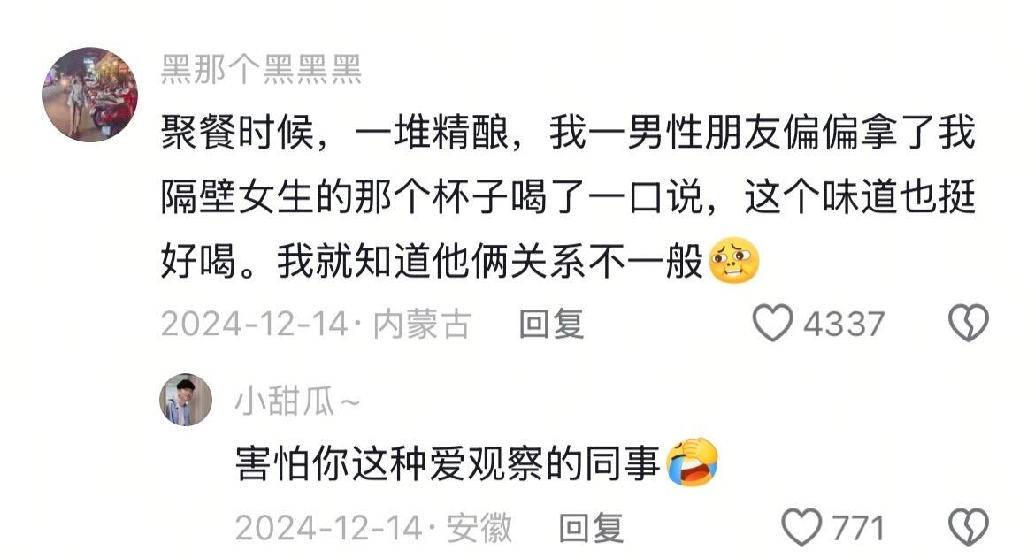 聚餐时候,一堆精酿,我一男性朋友偏偏拿了我隔壁女生的那个杯子喝了一口说,这个味道也挺好喝。我就知道他俩关系不一般