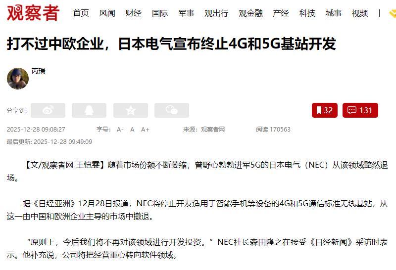 还想跟中国比?离开美国的日本,什么都不是! 据媒体10月28日报道:日本电气(NEC)要从4G、5G基站领域撤场了。它已经明确说不再往这领域投钱搞开发,要把重心转到软件上。其实这消息一点不意外,核心就是一句话:打不过中国和欧洲的企业。 先跟大家说清楚,基站就是咱们手机的“信号塔”,没它刷视频、发语音都不行。 以前NEC也是日本科技界的脸面,2020年的时候野心特别大,拉着日本最大的电信公司NTT合作。 NTT砸了42亿人民币帮它搞5G研发,还放话要在2030年拿下全球20%的市场份额,想借着美国排挤华为的机会分一杯羹。可没几年就撑不住了,说到底还是实力不行。 用数据说话更明白,现在全球基站市场基本被中国华为、欧洲爱立信和诺基亚包圆了,这三家加起来占了近80%的份额,十个基站里有八个是它们造的。 而NEC加上另一家日本企业富士通,俩家加起来份额还不到2%,连人家零头都不够。 通信行业特别烧钱,卖得少就亏得多,NEC后来5G业务越亏越多,干脆都不敢公布数据了。 更惨的是,NEC不光在国际上打不过,连自己家门口的生意都守不住。以前日本最大的运营商还优先买它的设备,后来也不买账了,转头去买欧洲爱立信的。 这也不能怪人家绝情,做生意肯定选性价比高、靠谱的,爱立信的设备比NEC的好用多了。 而且NEC还选错了技术方向,想把不同厂家的设备拼起来造基站,结果这技术毛病一大堆,又不稳定又难维护,根本比不过华为、爱立信的成熟设备。 其实不光NEC不行,整个日本通信企业都扛不住了。另一家日本企业富士通早就把通信业务剥离出去了,还有京瓷,原本计划搞5G基站,后来也偷偷停了。 为啥会这样?关键还是中欧企业优势太大。就说技术专利,全球5G核心专利中国企业占了40.8%,华为一家就占15%,稳居第一;日本企业连话语权都没有,怎么竞争? 日本还想拉着美国等国搞6G联盟排挤中国,可通信行业拼的是真本事,靠拉帮结派没用。 现在NEC转做软件,就是没办法的办法,至于它说要搞6G,目前也就整个原型机,传输距离才100米,能不能成还不好说。 说到底,NEC撤场就是市场选择的结果,中欧企业有完整的产业链、大市场和核心技术,日本企业又没规模又没技术,自然打不过。这也说明,科技竞争靠的是硬实力,耍小聪明没用。