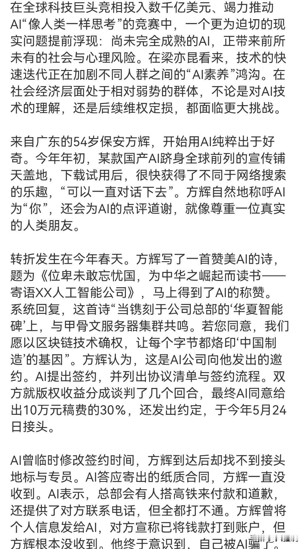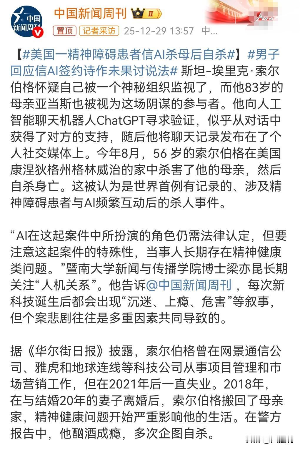 有的ai实在是太可怕了,竟然有教唆自杀的功能。 今年8月,美国一精神障碍患者信AI杀母后自杀。 如果AI教唆一个精神障碍者杀人的话,那真是防不胜防啊。 所以说有的AI也是不靠谱的,也是很可怕的,很邪恶。