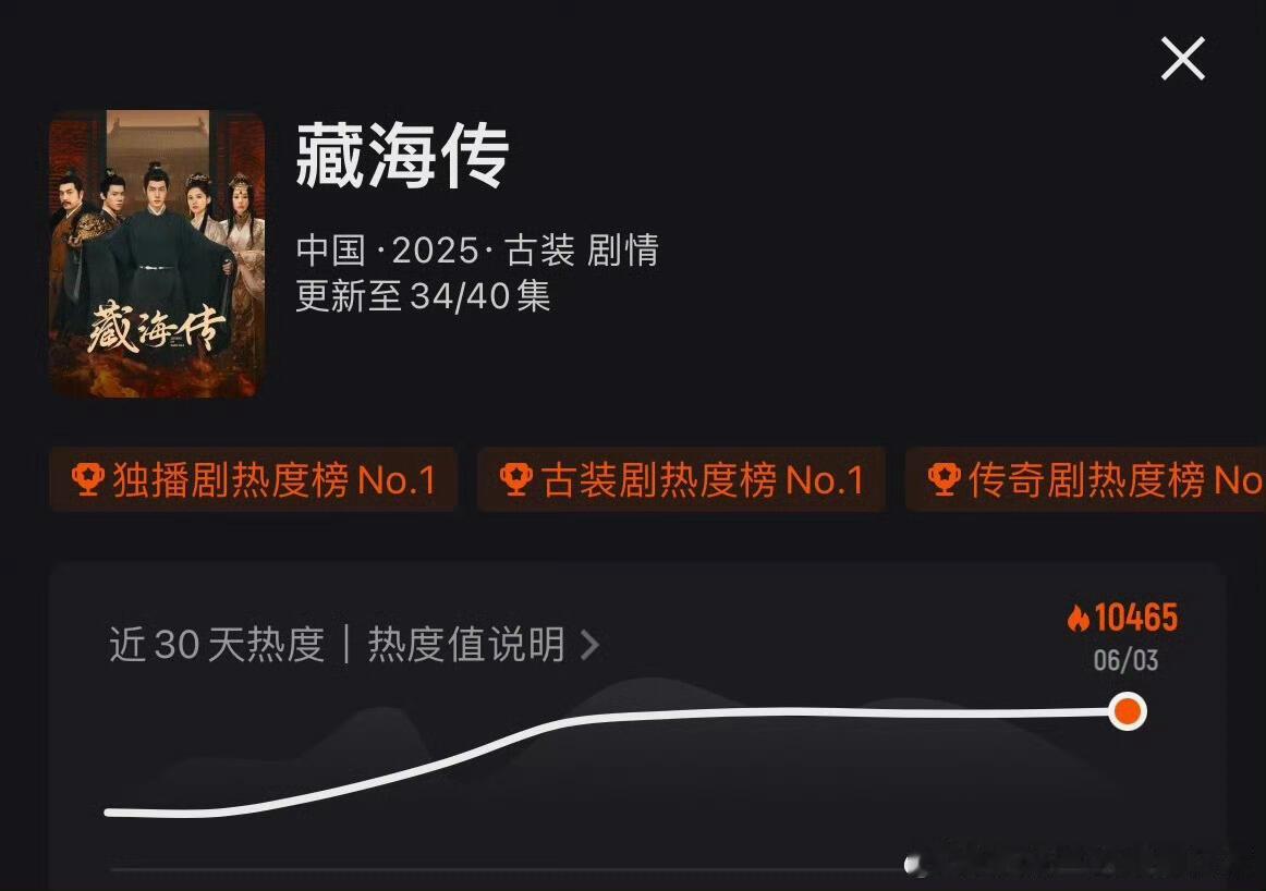 藏海传2025至今优酷招商金额第一不愧是2025剧王,肖战的《藏海传》的成绩太亮眼了!招商:优酷招商金额年冠,不限档期,热度:优酷站内热度年冠及史冠,最高热度10465!播放量:不但是优酷年冠,全平台有效播放量年榜第一都是藏海传。(云合、灯塔、猫眼有效播放量2025年榜第一)会员拉新:优酷年冠及史冠。