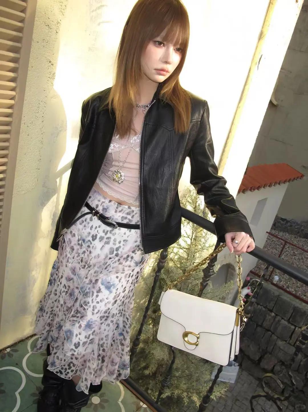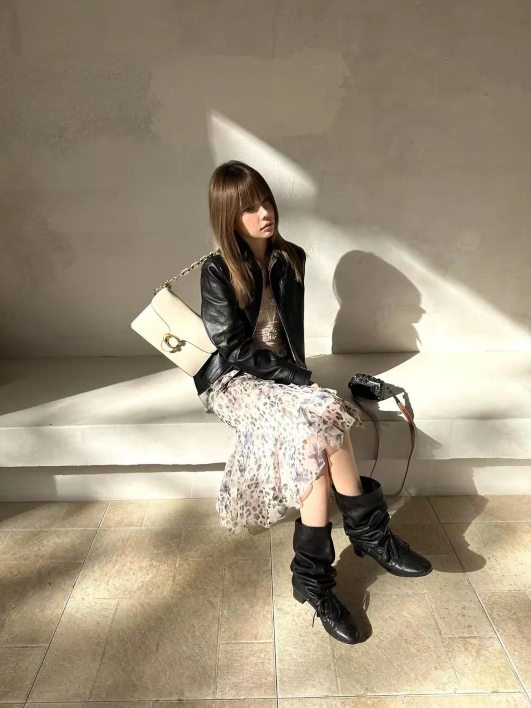 都市街头,酷炫皮夹克与牛仔裤的搭配永远不会过时。就像丁笑滢的这身酷飒穿搭,短款黑