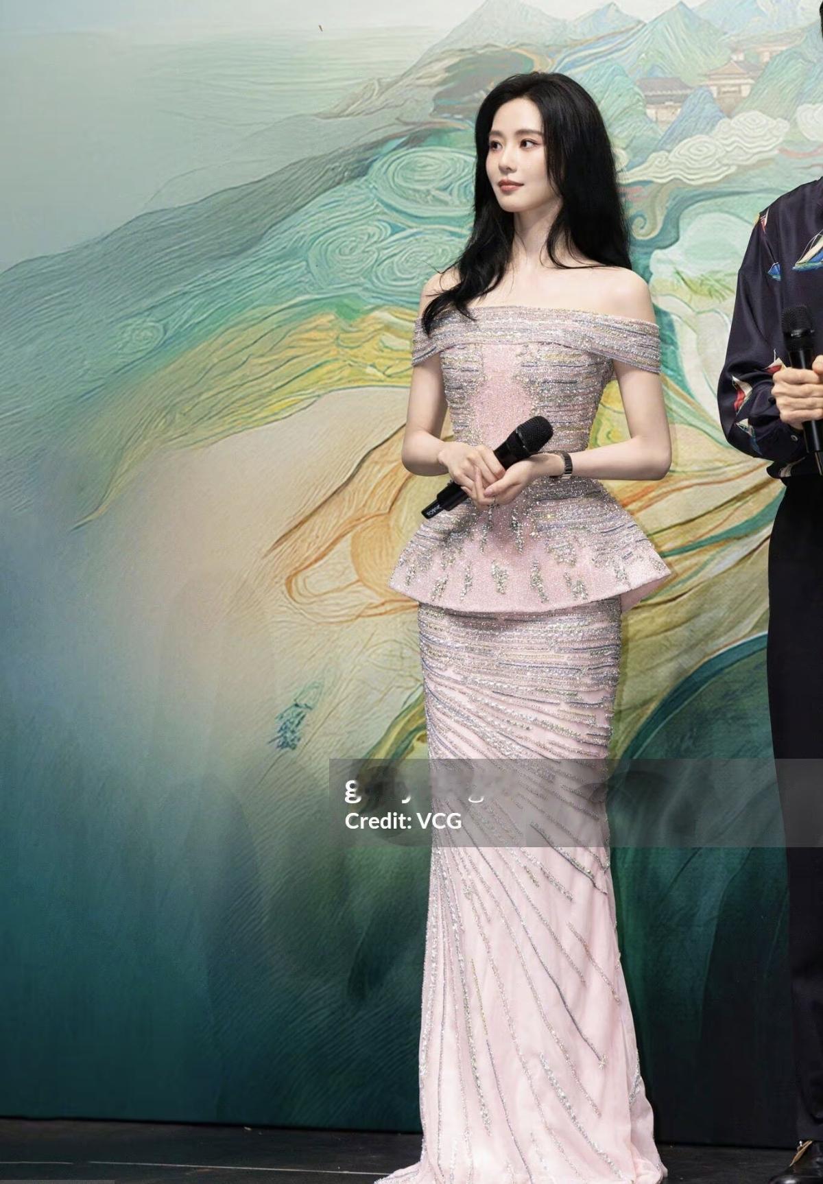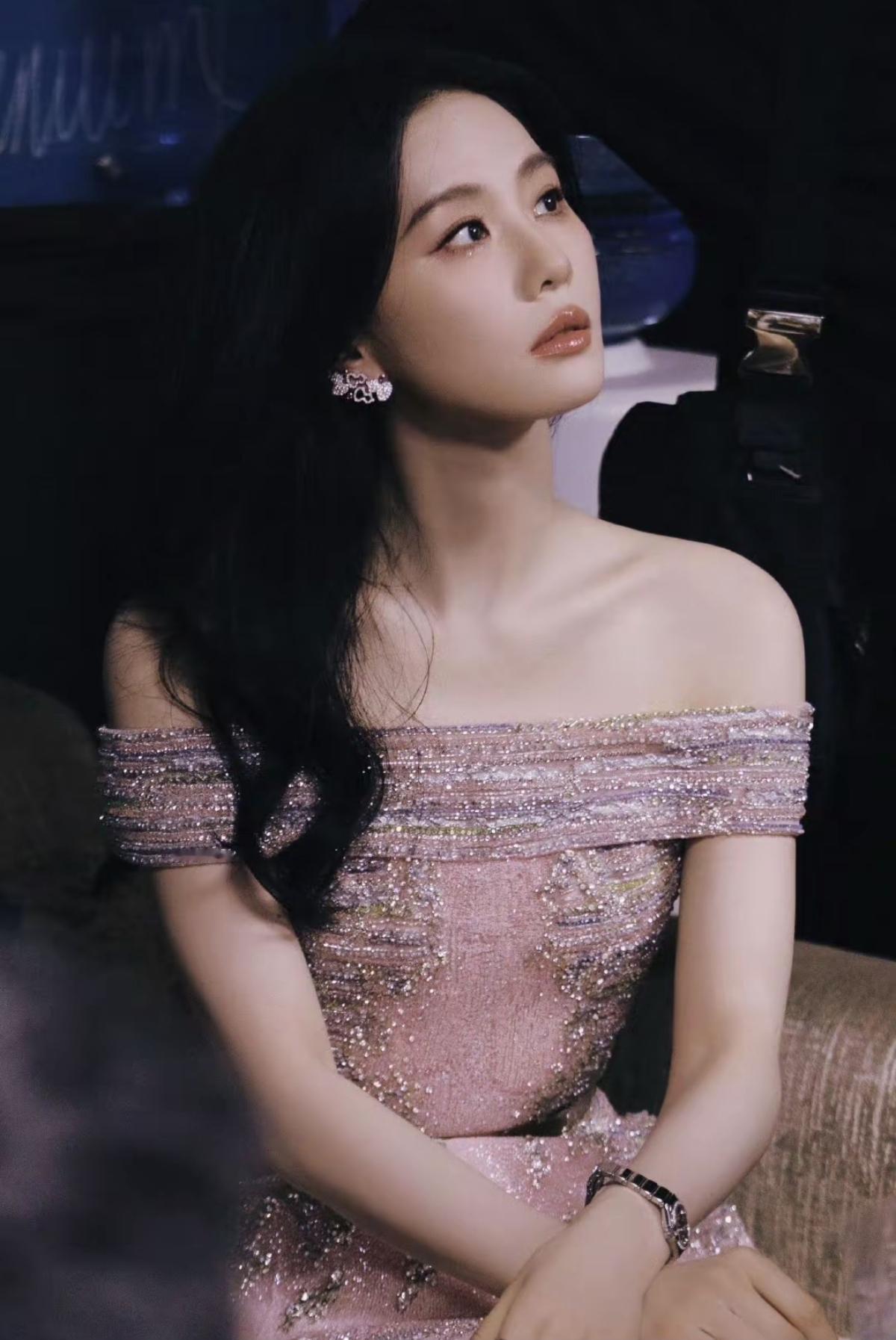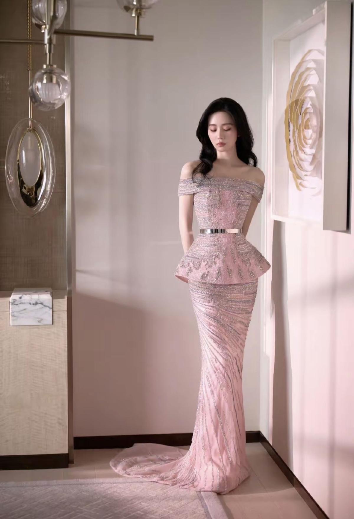 粉色闪钻鱼尾礼裙,一字肩设计露出精致肩颈线,裙身缀满闪钻与斜纹褶皱,鱼尾剪裁勾勒出窈窕身姿,搭配黑长卷发,温婉中透着精致华丽[比心][给力]娱乐明星