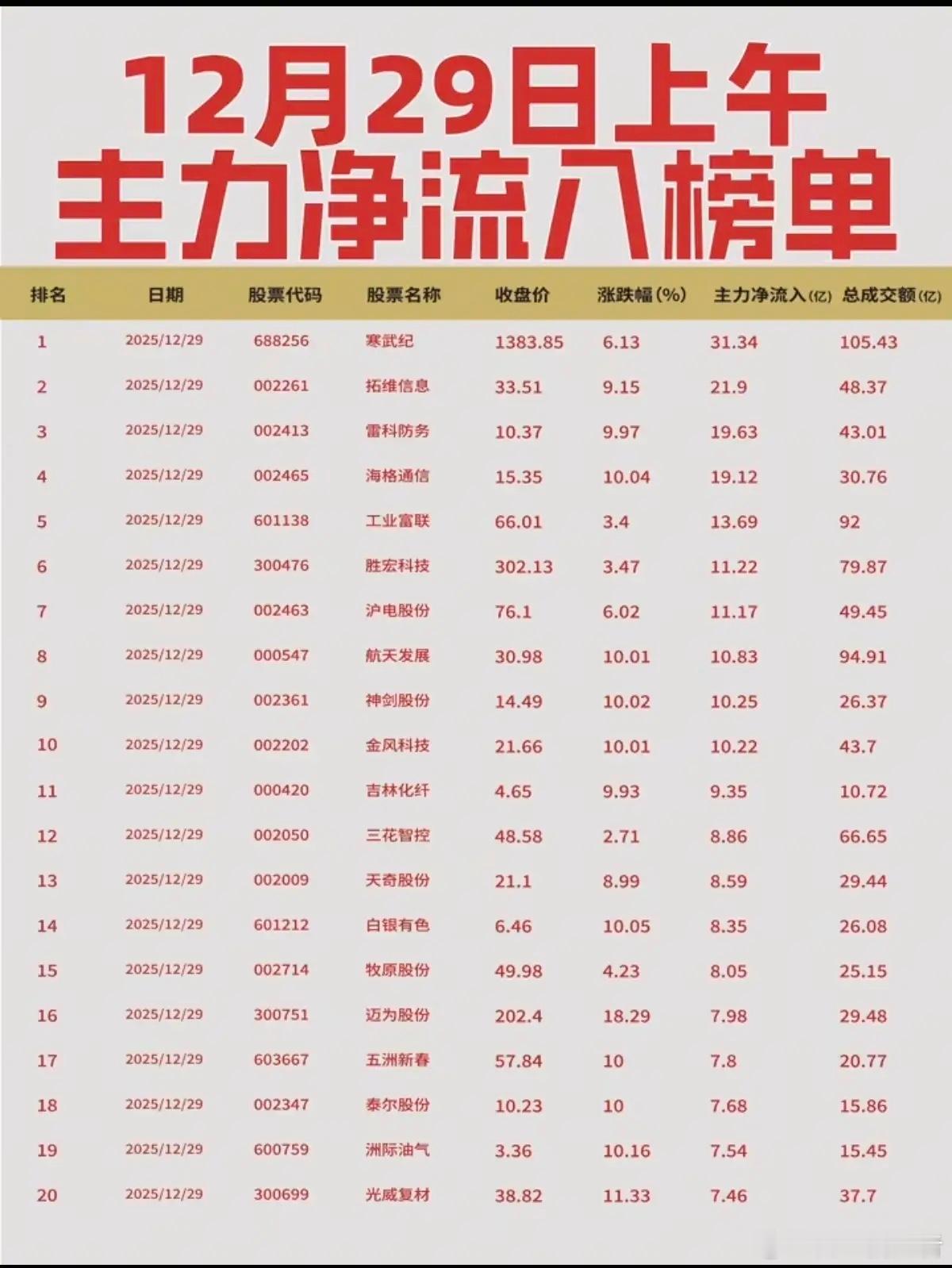 12.29(周一)A股主力资金动向TOP20监测报告从资金流向来看,今日场内资金呈现明确的结构性调仓特征。资金净流入核心方向:化学纤维、脑机接口、碳纤维、PEEK材料四大板块获主力资金重点布局,相关赛道或因产业政策催化、业绩预期改善等因素吸引资金进驻。资金净流出主要领域:氟化工、人造肉、福建板块、医药商业、磷化工、零售连锁百货板块遭遇资金撤离,短期需警惕板块内个股因资金抛压引发的波动风险。今日看盘上证指数a股