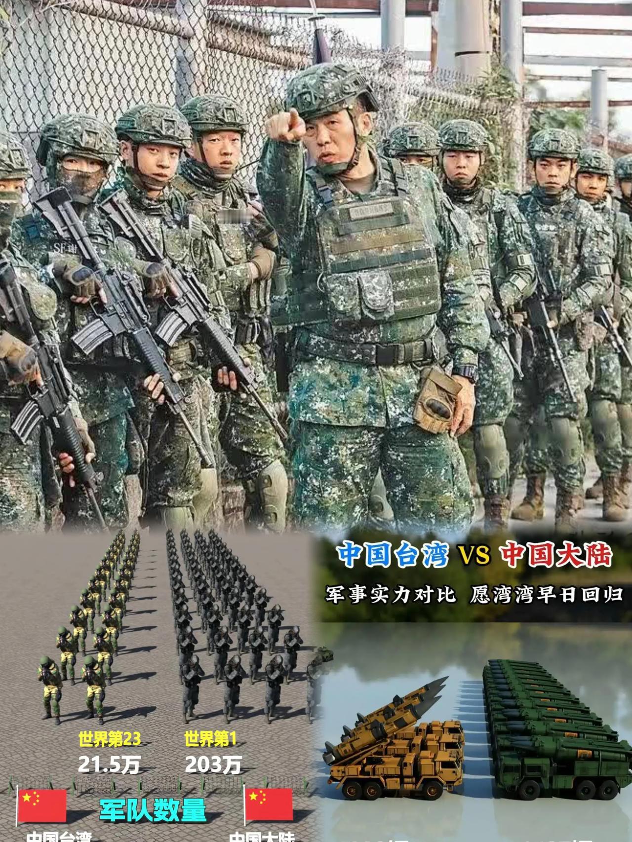 解放军对台军是碾压级差距!兵力10倍+装备代差,台独靠买武器纯属白扔钱! 解放军现役超200万(陆军97万+海空火箭军各司其职),台军仅21.5万;陆军坦克解放军6300辆vs台军不足千辆,海空军差距更悬殊:解放军3航母+770艘舰艇+3000架军机(含歼20五代机),台军无航母、117艘老旧舰艇、200多架无隐身三代机,连轰炸机都没有! 更有火箭军数千枚导弹全覆盖台海,东风17高超音速弹10分钟打遍全台,台军无战略威慑力,买的爱国者导弹还频发自爆;解放军075两栖舰可一键投送加强营,台军装甲车焊裂成“病猫”,士兵逃兵率超24%、训练躲遮阳伞,根本无战力! 台海平均180公里无战略纵深,台能源粮食7-9成靠进口,解放军一封锁2-3周就瘫痪,再加上民心向背,台独以武谋独就是死路一条,统一是铁板钉钉的历史必然!