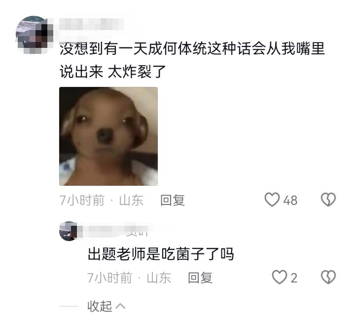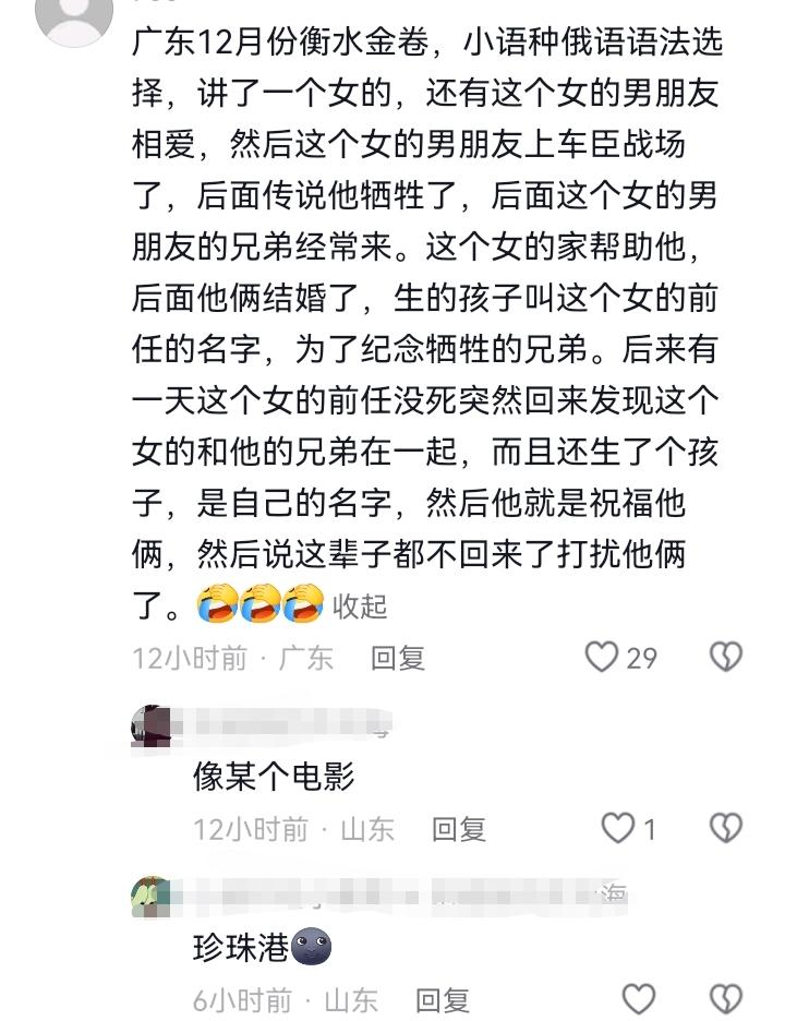 现在的考试颠成这样了吗?上个周末是山东高中生合格考的时间,就是昨天和前天,原本正常的考试也没什么,可是这两天很多学生都在网上说考试内容像是电脑被病毒入侵了一样。。。。 看看这考的都是什么东西:8岁的小女孩爱上20岁的邻居;战友娶了兄弟的女朋友,生了孩子起的名字是兄弟的名字;女儿5岁,妈妈20岁,姥姥35岁;91岁老太太早晨4点起来要努力工作到100岁。。。 这都是些什么题目啊,以至于学习不扎实的孩子们都以为自己看错了,学习好的孩子们看了也怀疑人生,这考的内容是正常能发生的事情吗。。。 到底是哪个环节出了问题。。。