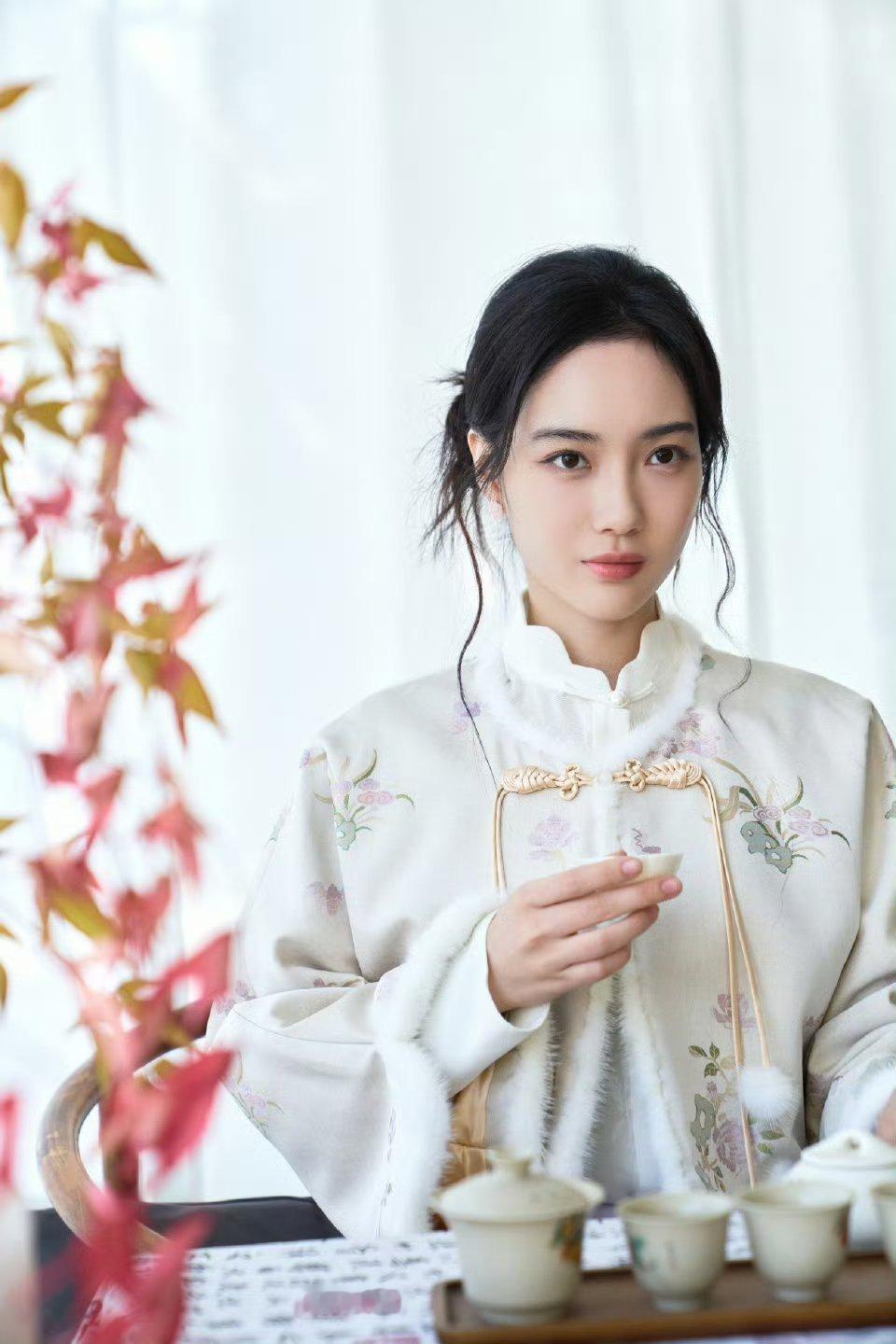 赵嘉敏新中式美人赵嘉敏在《玉茗茶骨》首映礼造型我一整个爱住了,新中式毛绒上衣搭紫