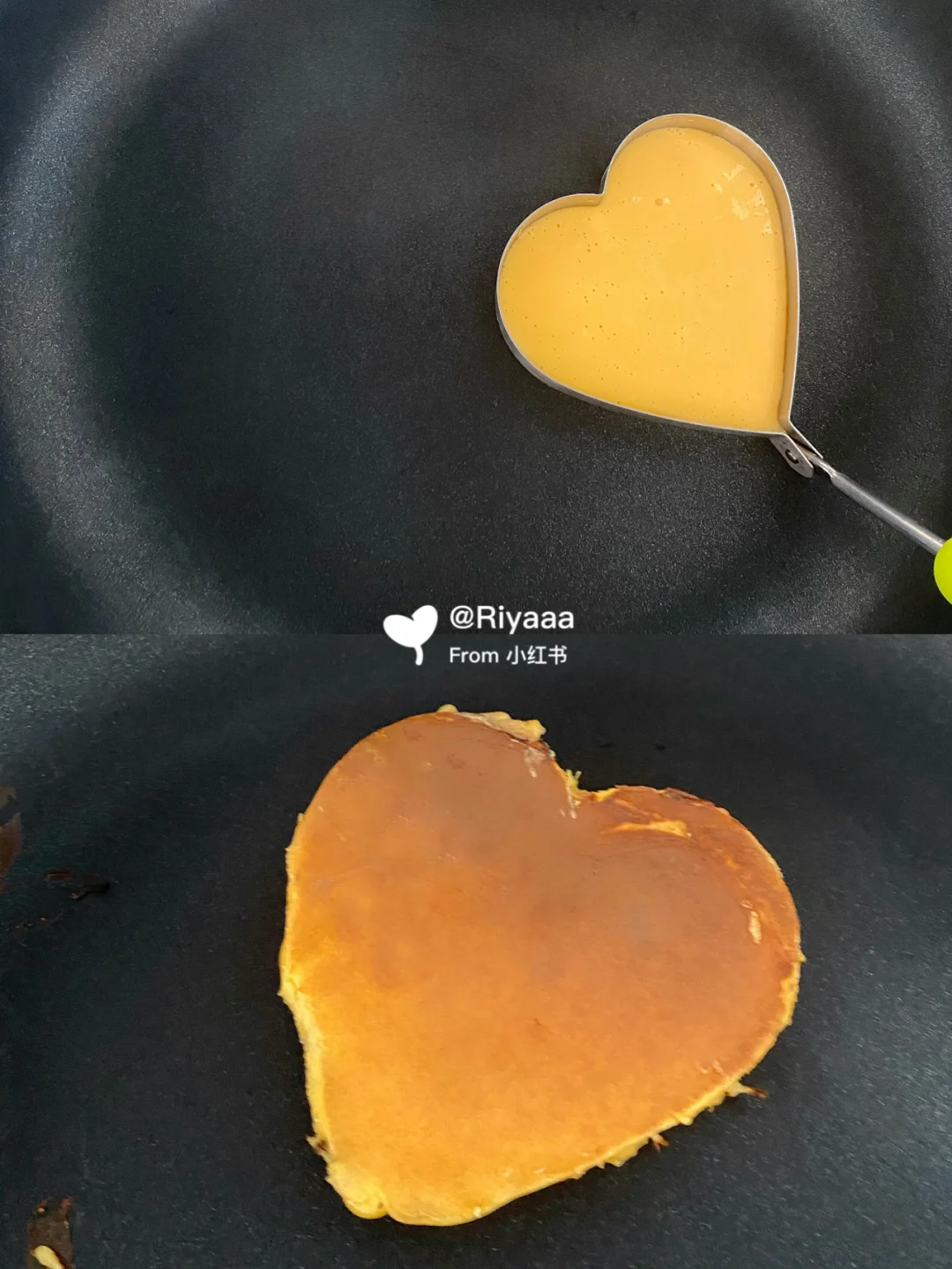 4.约10秒后可以随意移动模具不粘锅时,用勺子小心地沿着边缘脱模(记得戴防烫手套,别被热气烫伤啦!),小心地将松饼翻面,再过10秒就可以盛出咯