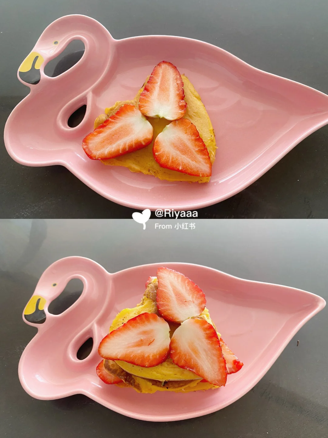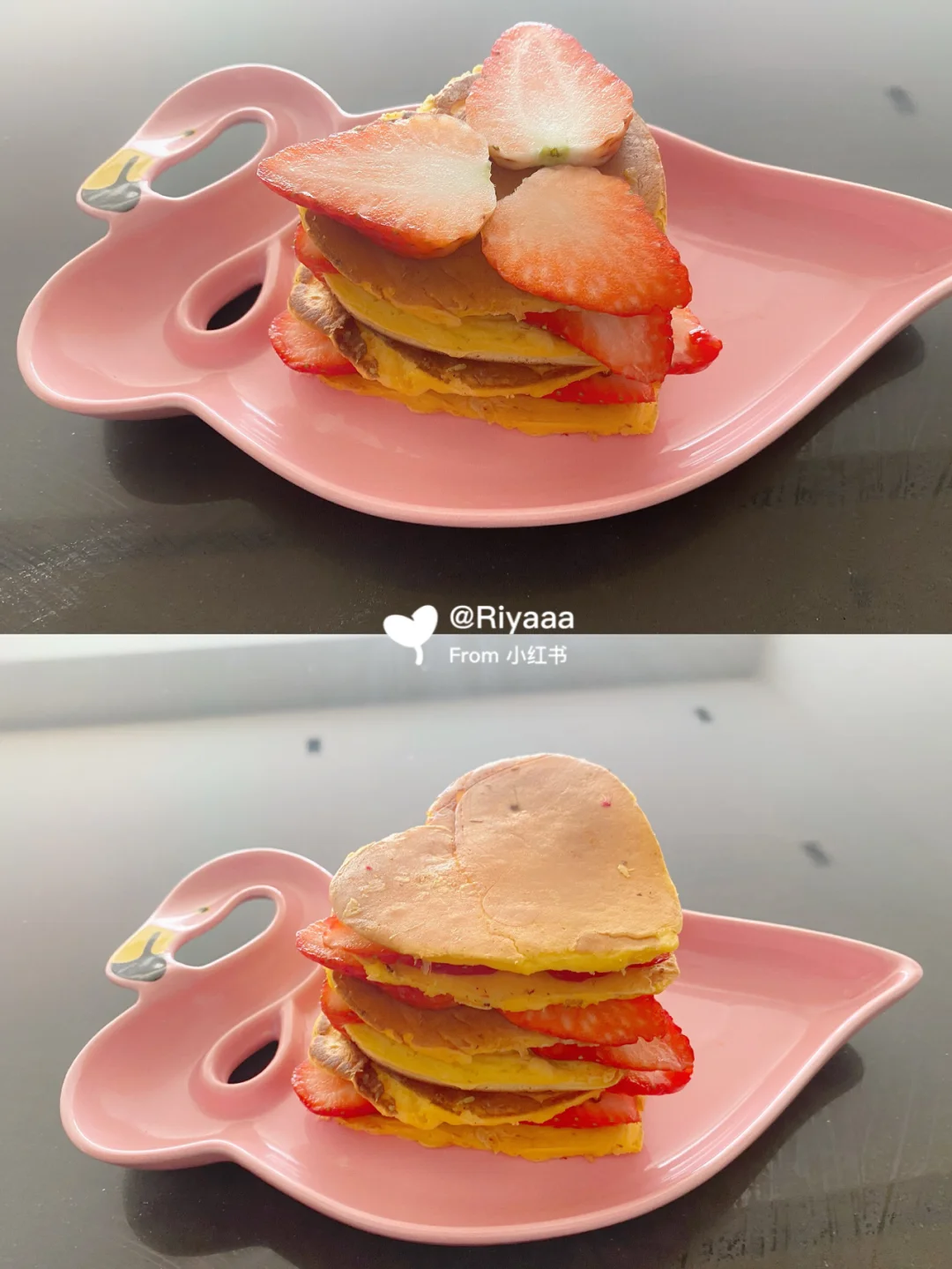 5.草莓切片叠叠乐(不减肥的宝宝可以每层抹一点奶油更好吃哦)叠完后撒点糖粉或者淋上酸奶就完成啦![黄金薯R]